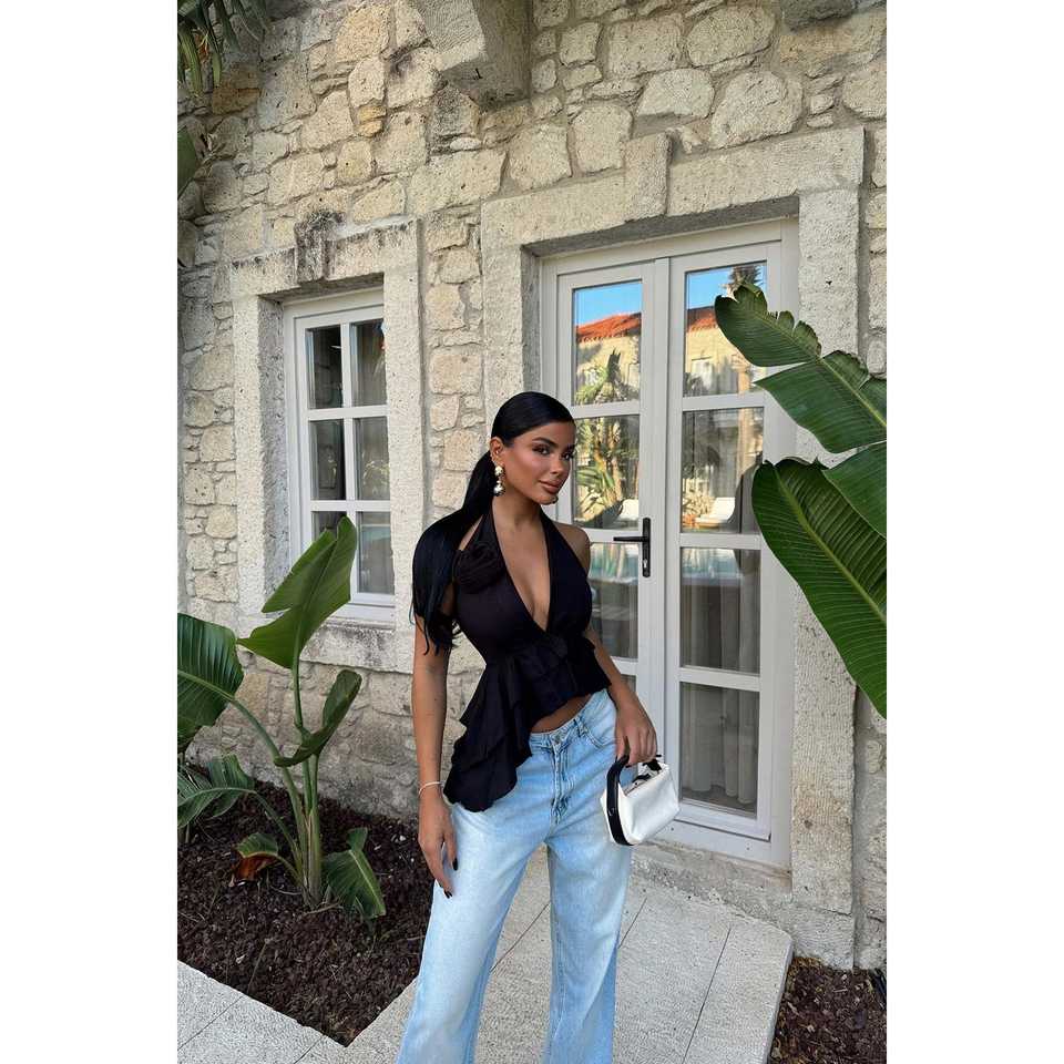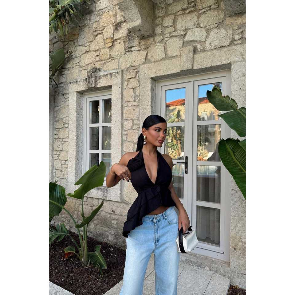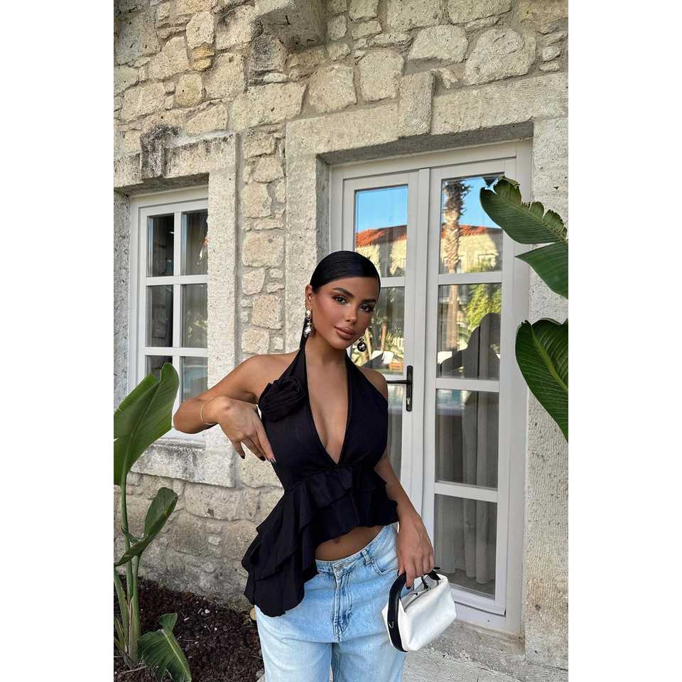 เสื้อครอปผูกเชือกสีดำลายดอกกุหลาบสำหรับผู้หญิง เสื้อกล้ามผู้หญิง