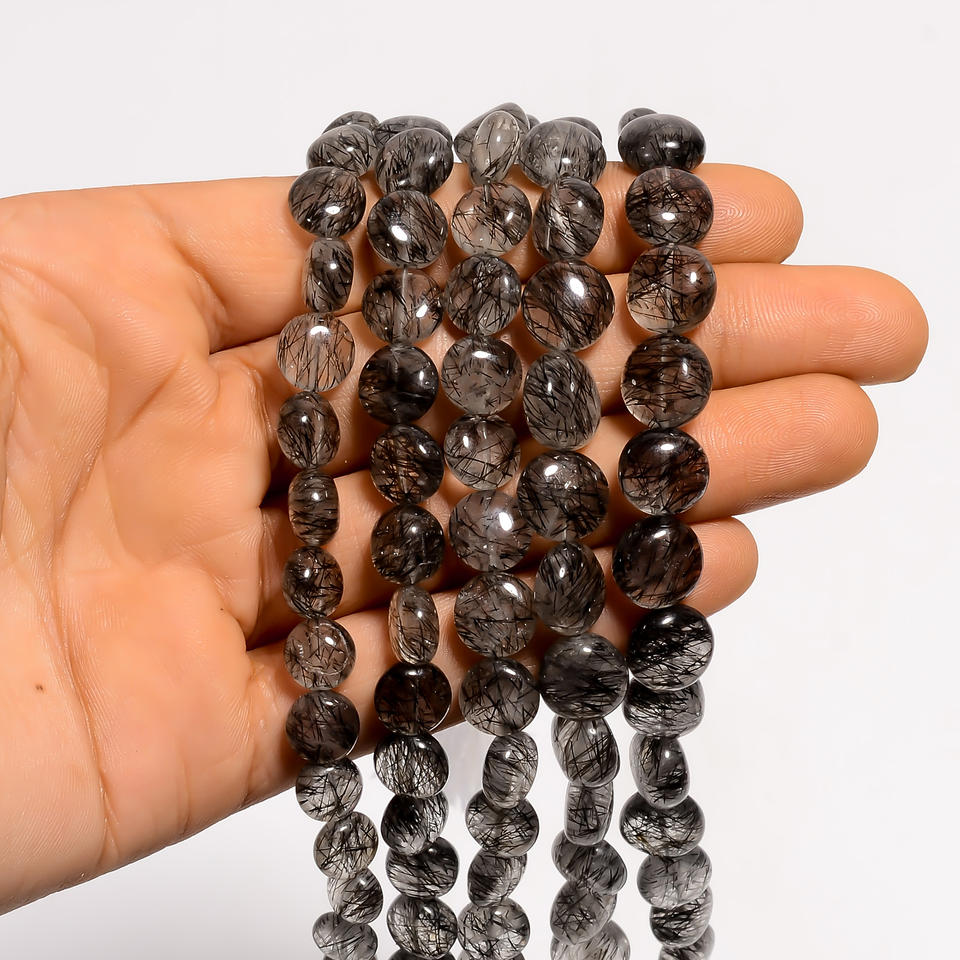 ลูกปัดรูปเหรียญควอตซ์สีดำ rutile สีดำพลอยควอตซ์ rutile ลูกปัดเรียบเครื่องประดับทำลูกปัดอัญมณีธรรมชาติ8นิ้ว