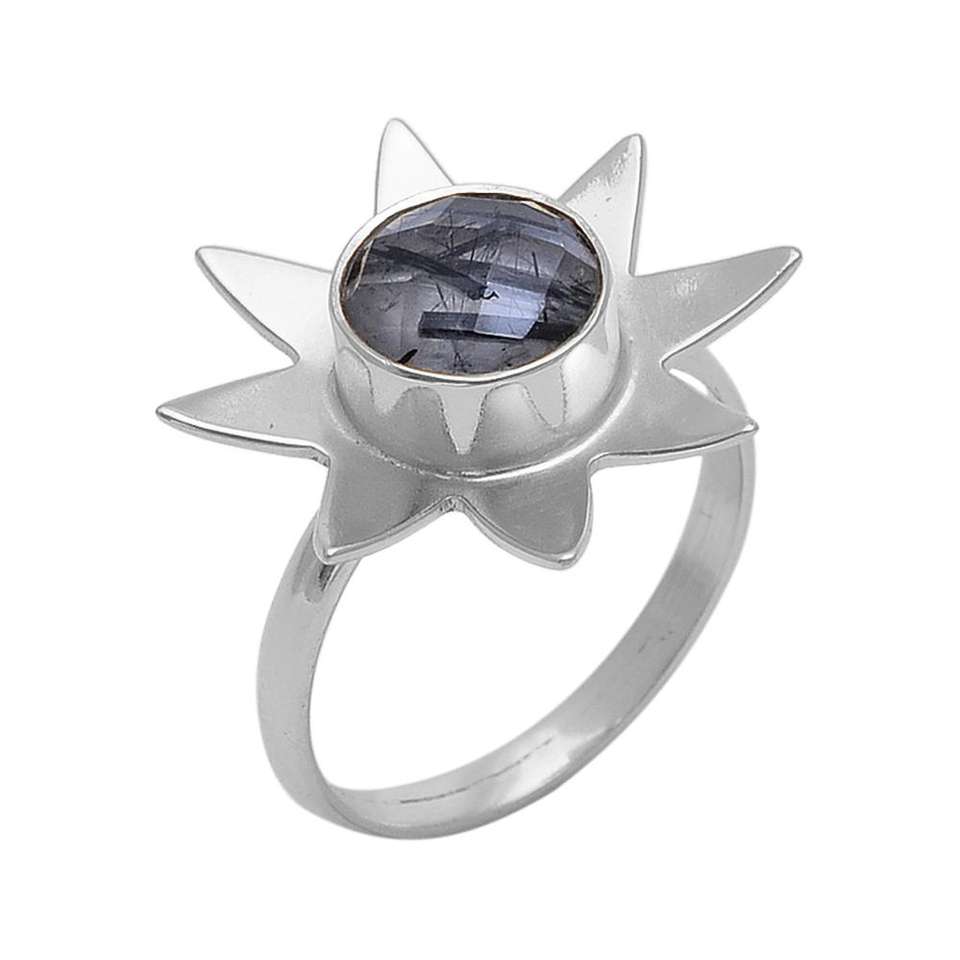 พลอยควอตซ์สีดำ rutile เครื่องประดับเงินสเตอร์ลิง925แหวนทองคำขายส่งแหวนดอกไม้แฮนด์เมดเครื่องประดับแหวนรูปดอกไม้