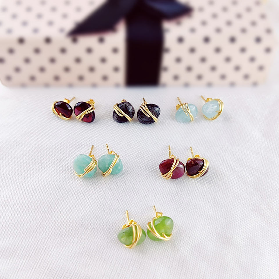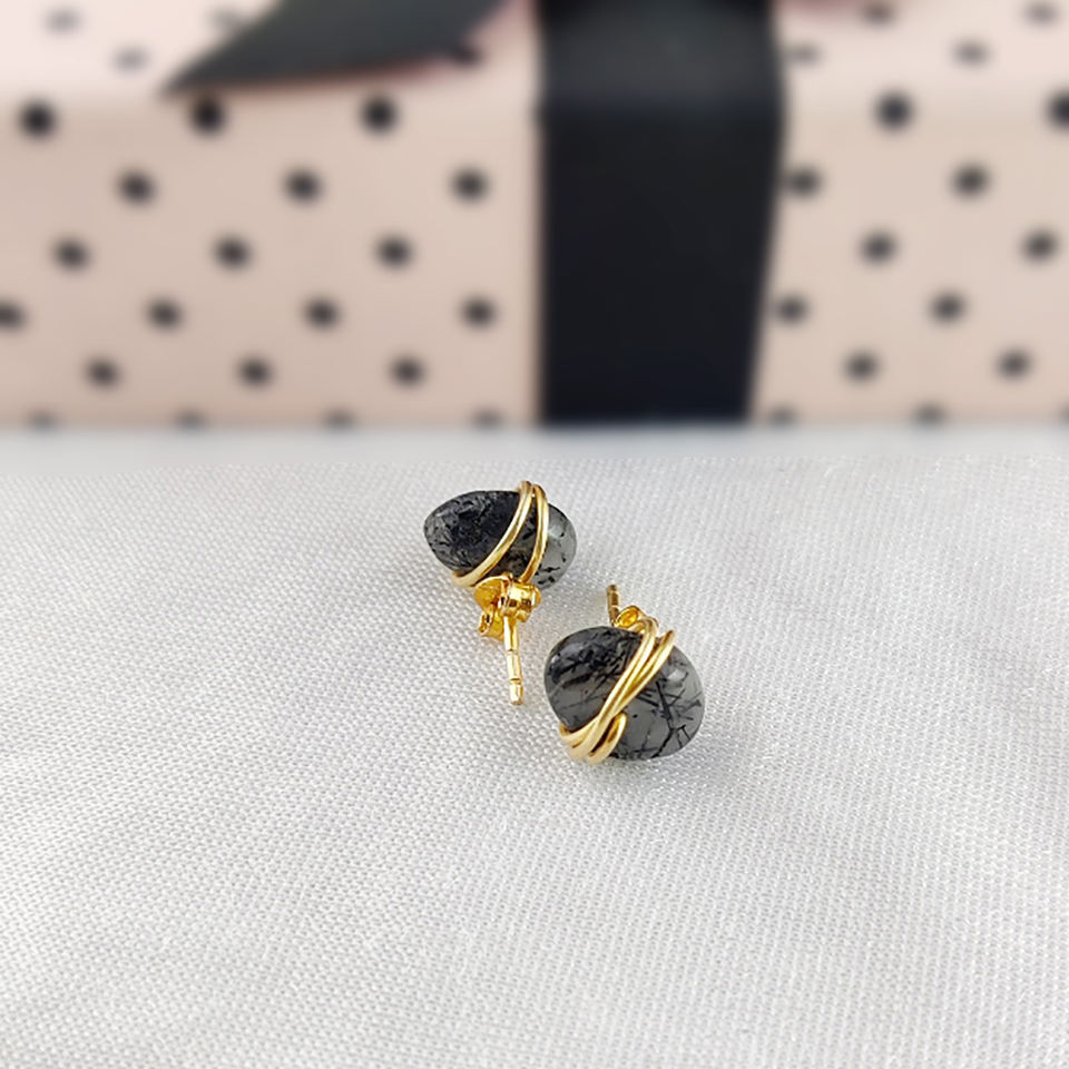 ต่างหูควอตซ์รูไทล์สีดำขนาดเล็ก ประดับด้วยลวดทองคำชุบ หินธรรมชาติ เครื่องประดับประจำเดือนเกิด ขายส่ง