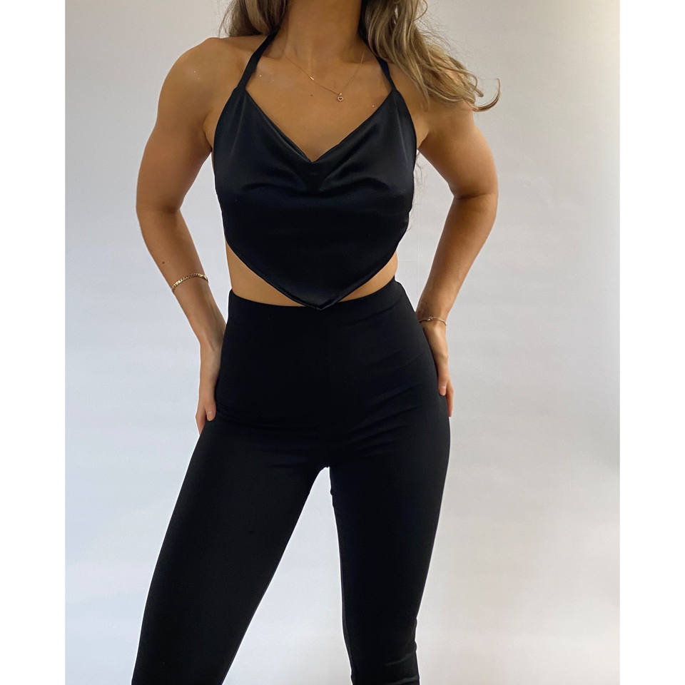 ผ้าซาตินสีดำเปิดหลังคอวัวผ้าซาตินทรงสามเหลี่ยมเสื้อทรงถั่วสตรีท