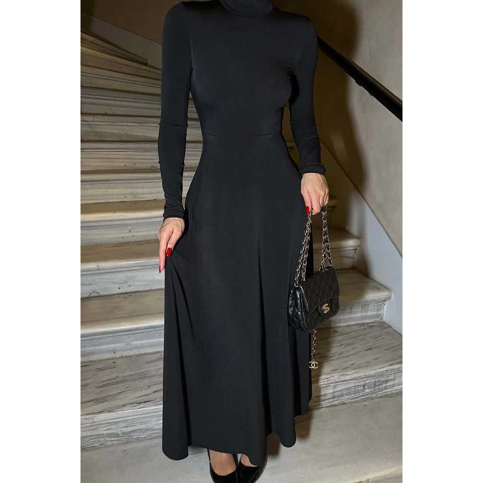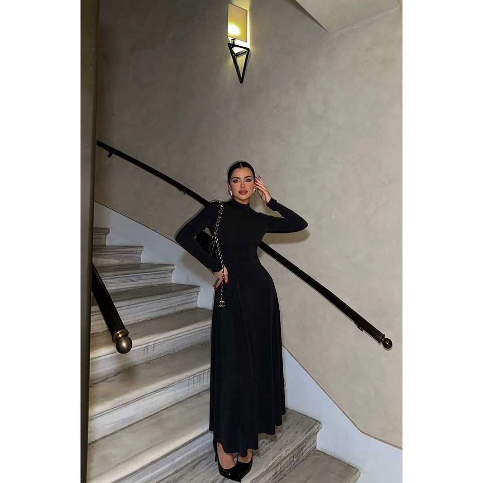 ชุดราตรีผ้าซาตินสีดำ คอสูง ทรงเอ็มไพร์ ปักลาย ทรงเอไลน์ กระโปรงบานทรงบอลกาวน์ สไตล์งานปาร์ตี้ มีไซส์ XS ถึง XL