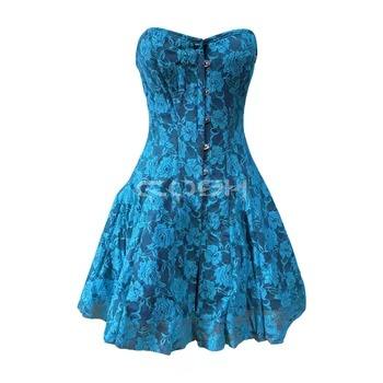 ชุดเดรสคอร์เซ็ตผ้าซาตินสีดำประดับด้วยผ้าตาข่ายลายดอกไม้สีฟ้าพร้อมตัวล็อคด้านหน้า