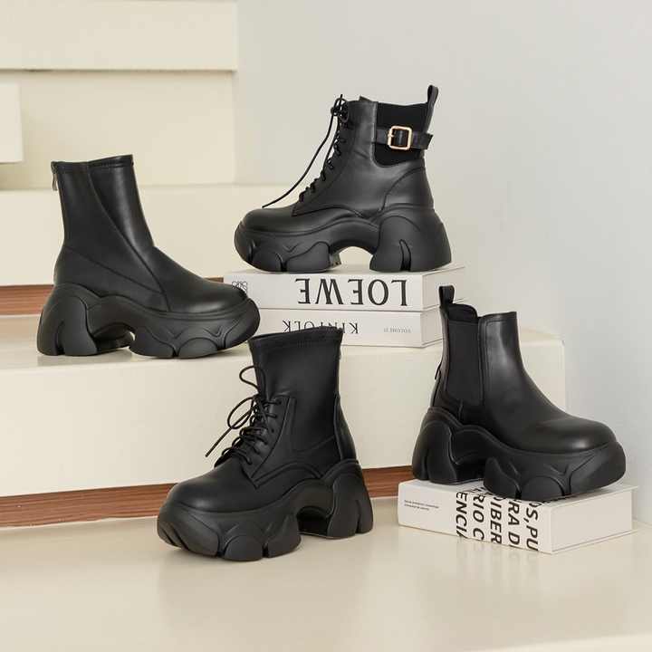 รองเท้าบูทหุ้มข้อสีดำ พื้นรองเท้าแบบสคัลป์ แพลตฟอร์มสูง แฟชั่นฤดูหนาว