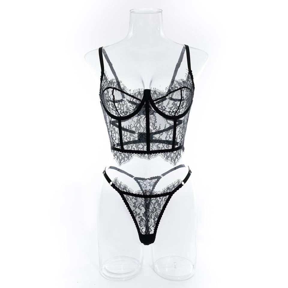 สีดําเซ็กซี่ลูกไม้ Fishbone Bra รูปร่างร่างกายชุดชั้นในเซ็กซี่ชุดทองชุด 2 ชิ้น