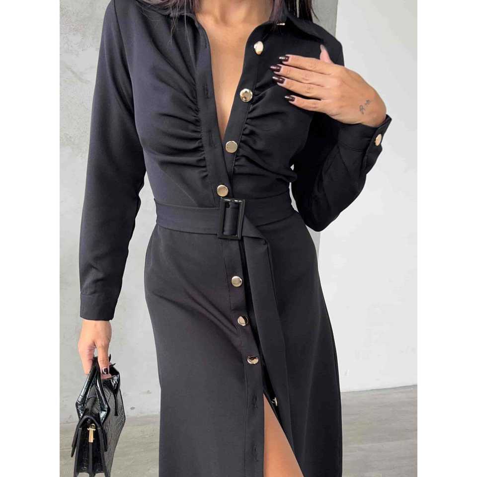 เดรสเชิ้ตสีดำแขนยาวติดกระดุมด้านหน้าเดรสลำลองแม็กซี่ไซส์ S ของผู้หญิง