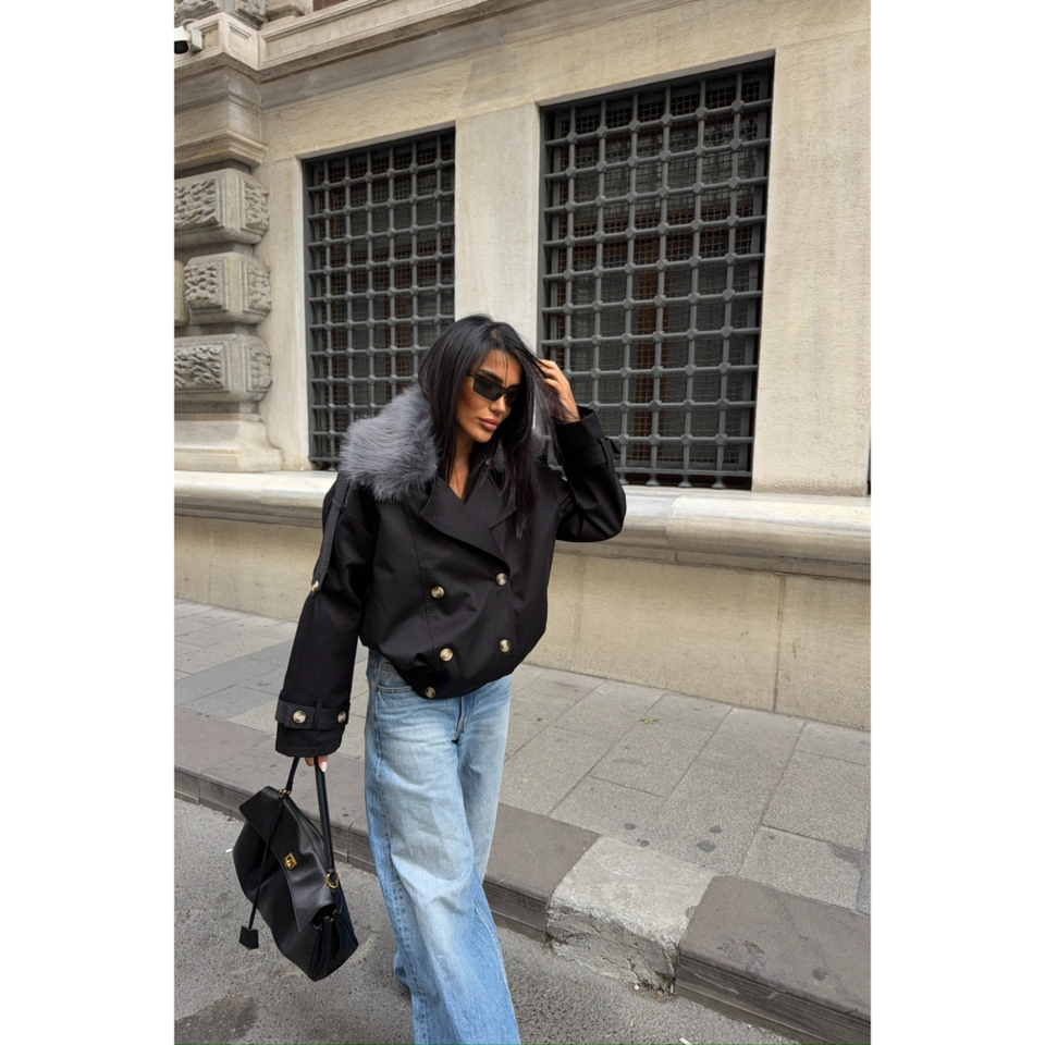 เสื้อโค้ทกันฝนสั้นสีดำพร้อมปกขนสัตว์ ไซส์ S สำหรับผู้หญิง เสื้อผ้าแฟชั่น