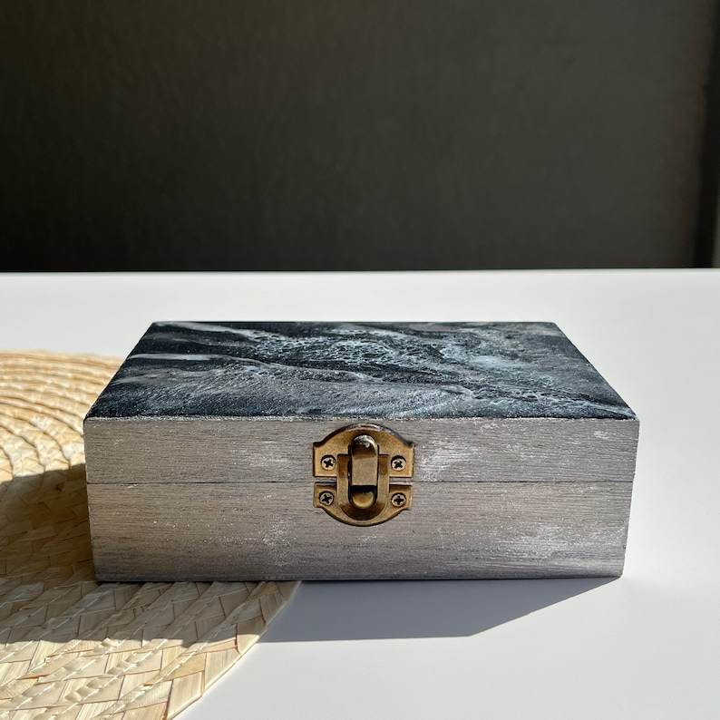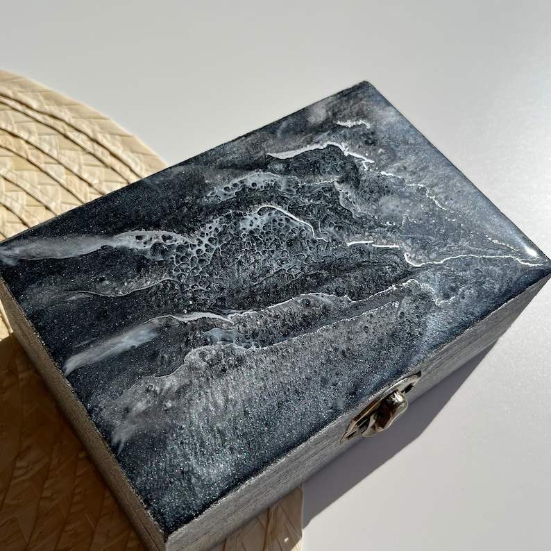 กล่องเก็บของเรซิ่นอีพ็อกซี่สีดำและสีเงิน งานศิลปะสมัยใหม่ วาดด้วยมือ เป็นมิตรกับสิ่งแวดล้อม กล่องใส่เครื่องประดับ