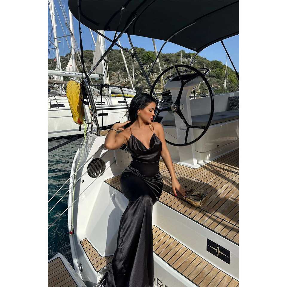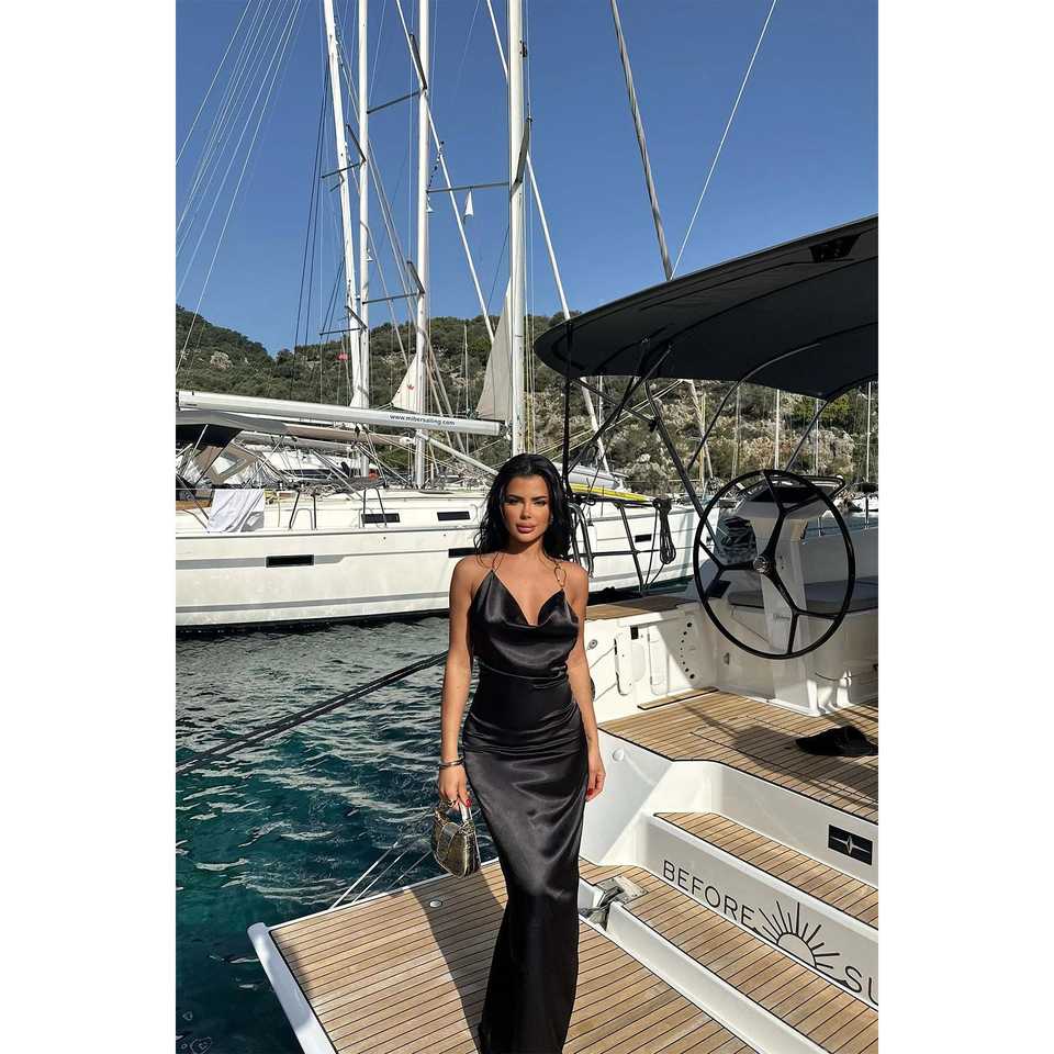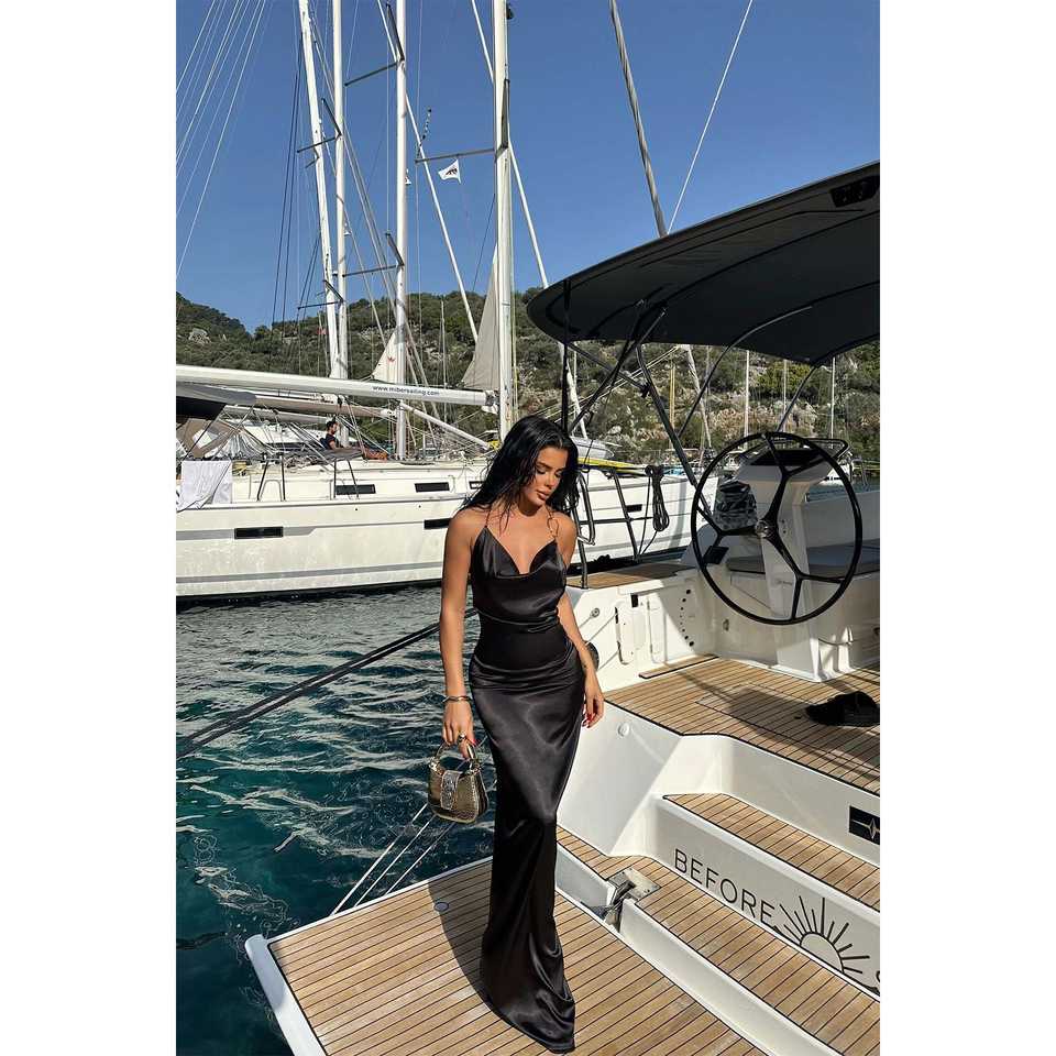 ชุดราตรีทรงเอไลน์ปักลายสีดำ Sofia คอสูง สายเดี่ยว ทรงเอ็มไพร์ เอวสูง สไตล์งานปาร์ตี้ มีไซส์ XS-XL