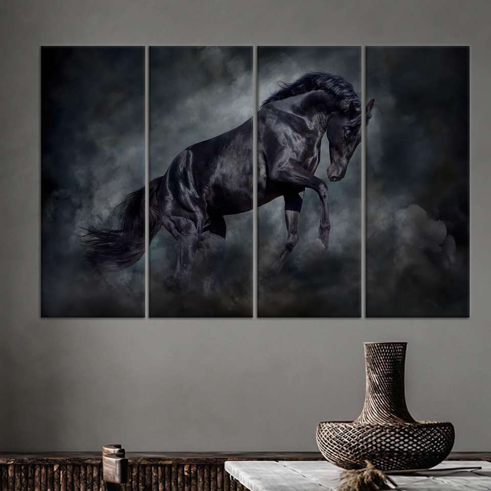 ภาพพิมพ์บนผ้าใบ Black Stallion: ภาพพิมพ์ม้าที่มีอารมณ์ขันและดราม่า ของตกแต่งบ้านสไตล์ชนบท ชุดผ้าใบ 4 ชิ้น