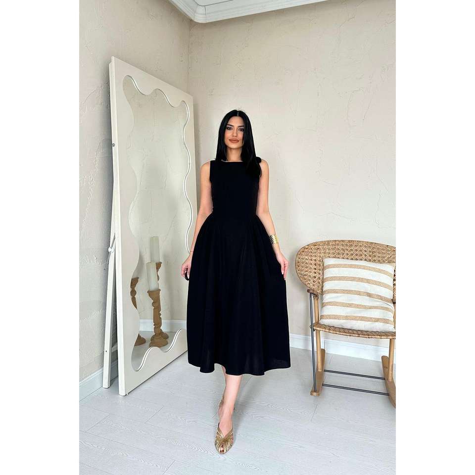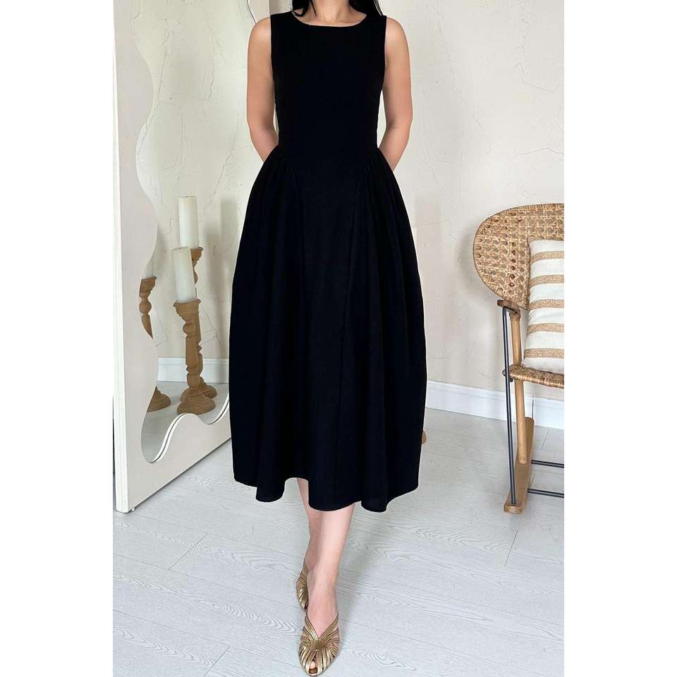 เดรสสีดำแบบไม่มีสายรัดไหล่ ทรงเอไลน์ เอวธรรมชาติ ผ้าลินินทอ ระบายอากาศได้ดี เหมาะสำหรับใส่ในชีวิตประจำวัน