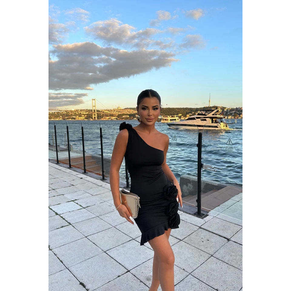 Black Strapless Mini Dress with Rose Detail Crocheted & Sequined Custom A-Line Empire Waist Simple Knee-Length Evening Design
