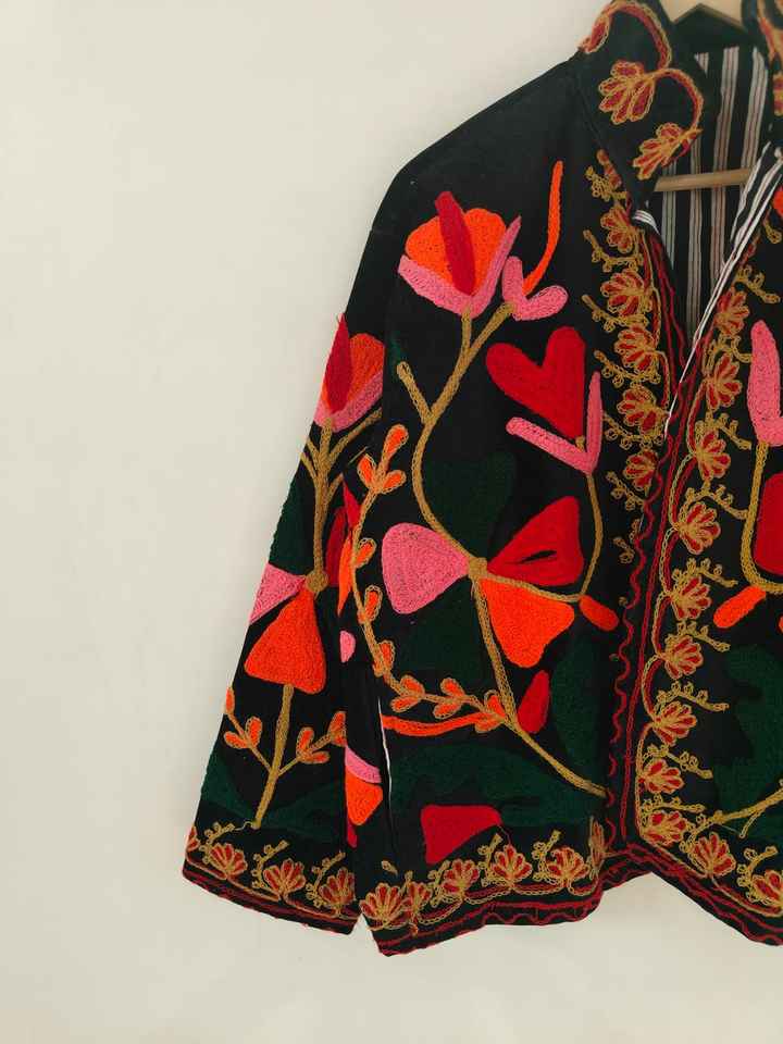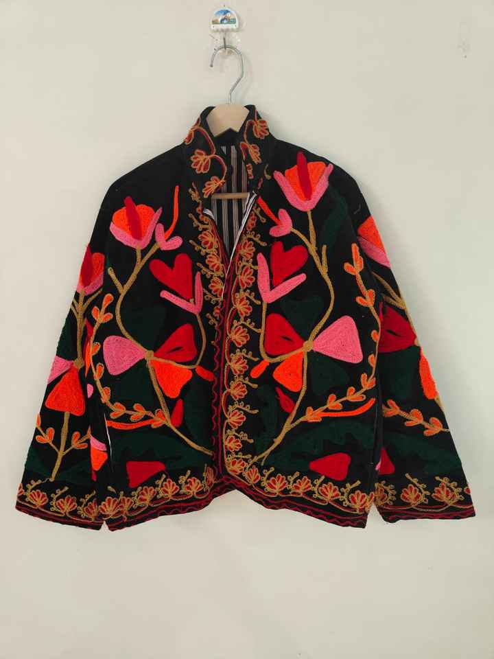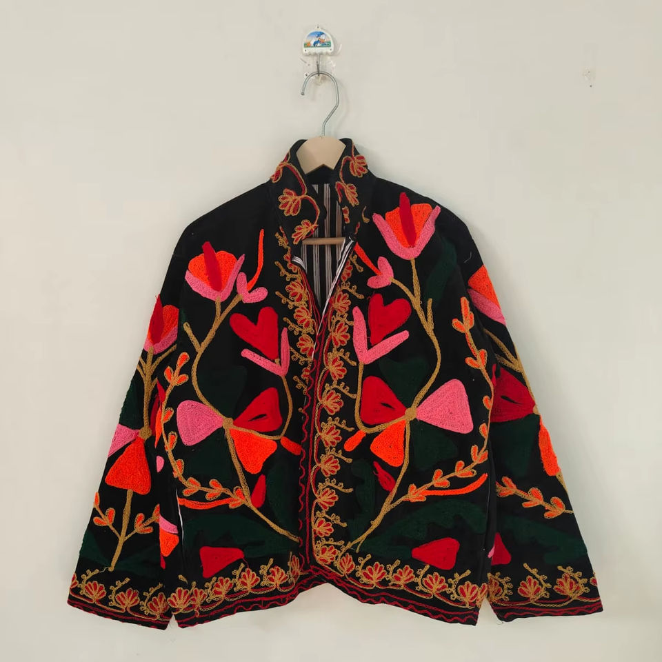 เสื้อแจ็คเก็ตกำมะหยี่ปักลายซูซานีสีดำ ลายดอกไม้สดใส เสื้อโค้ทศิลปะพื้นบ้านที่เป็นเอกลักษณ์ เสื้อคลุมสไตล์พื้นบ้านสีสันสดใส เสื้อแจ็คเก็ตปักลายซูซานีสีสันสดใส