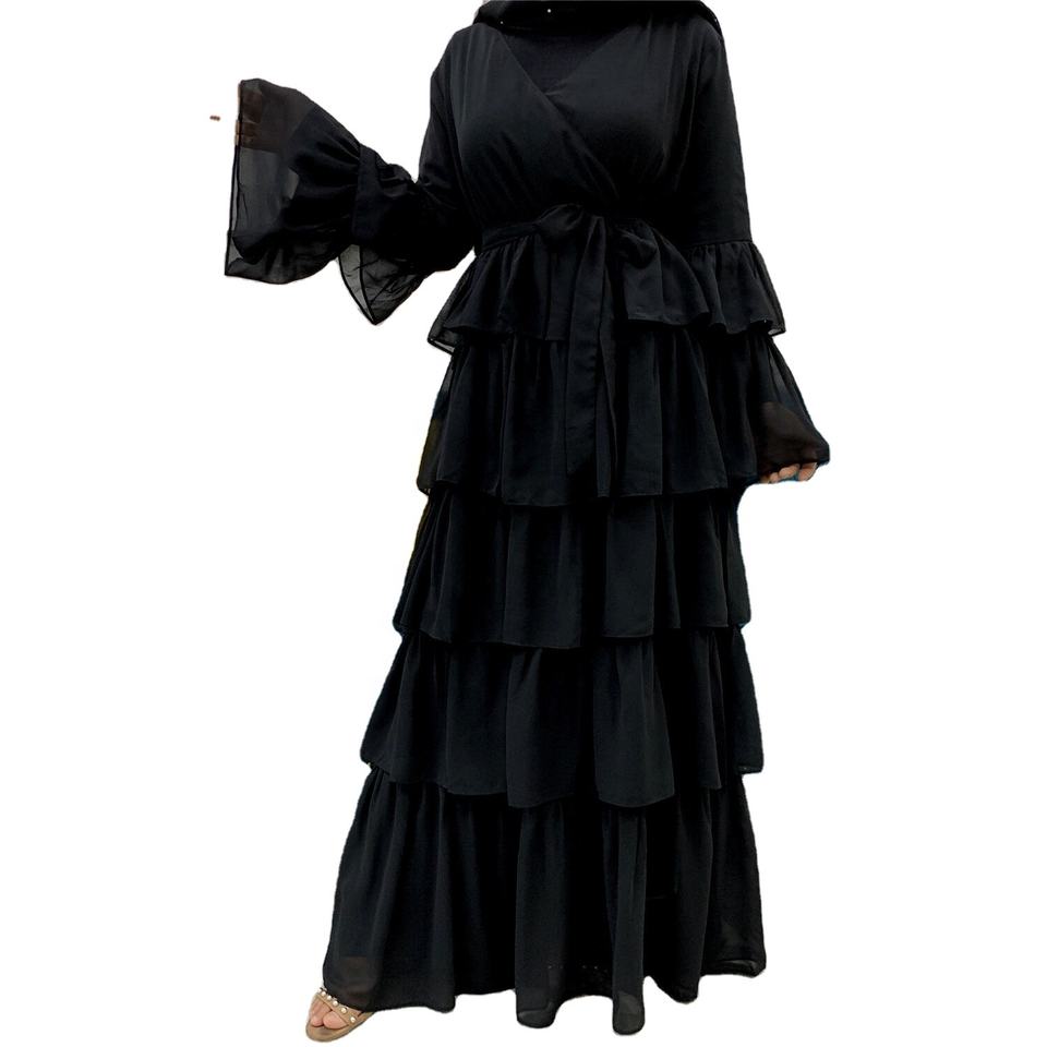 ชุดเดรสชีฟองแม็กซี่สีดำแบบเป็นชั้นของผู้หญิง,ชุดเดรสยาวคลุมรอบคอจับจีบชุดอาบายาดูไบเติร์กมุสลิมอิสลามสีดำสนิท
