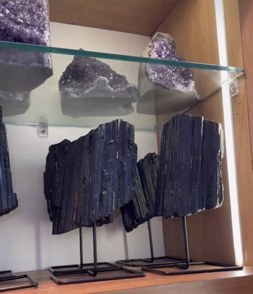 ทัวร์มาลีนสีดำบนจอแสดงผลโลหะยืนกับอัญมณีพลังงานเชิงลบจากอินเดีย