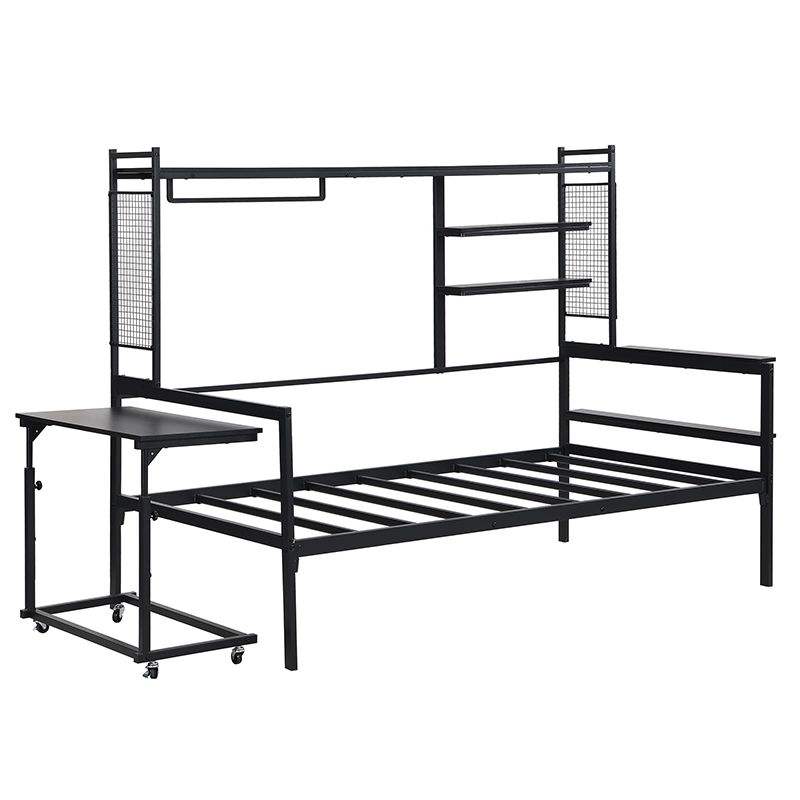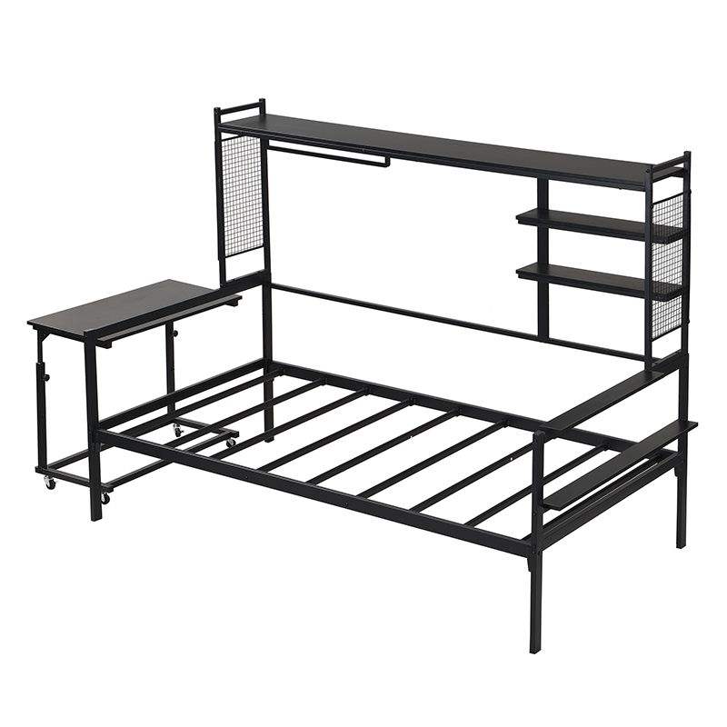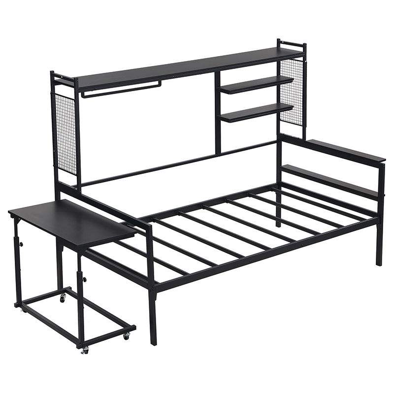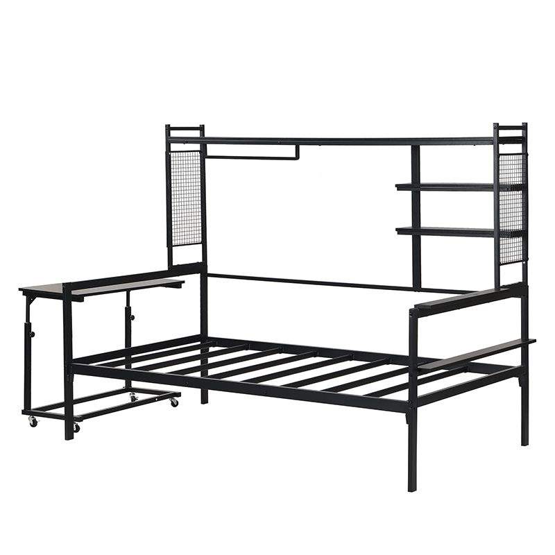 Black Twin Size Metal Daybed with Movable Desk Grid Shelves Clothes Hanger
