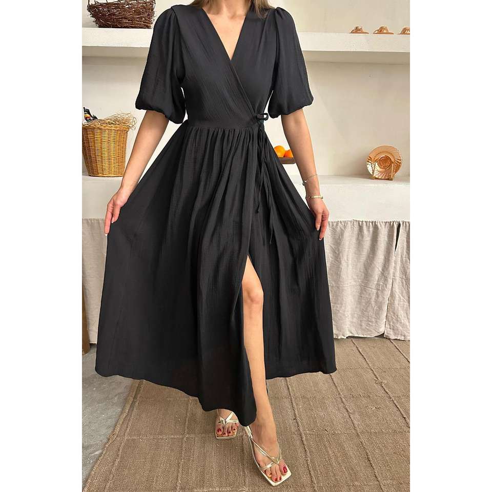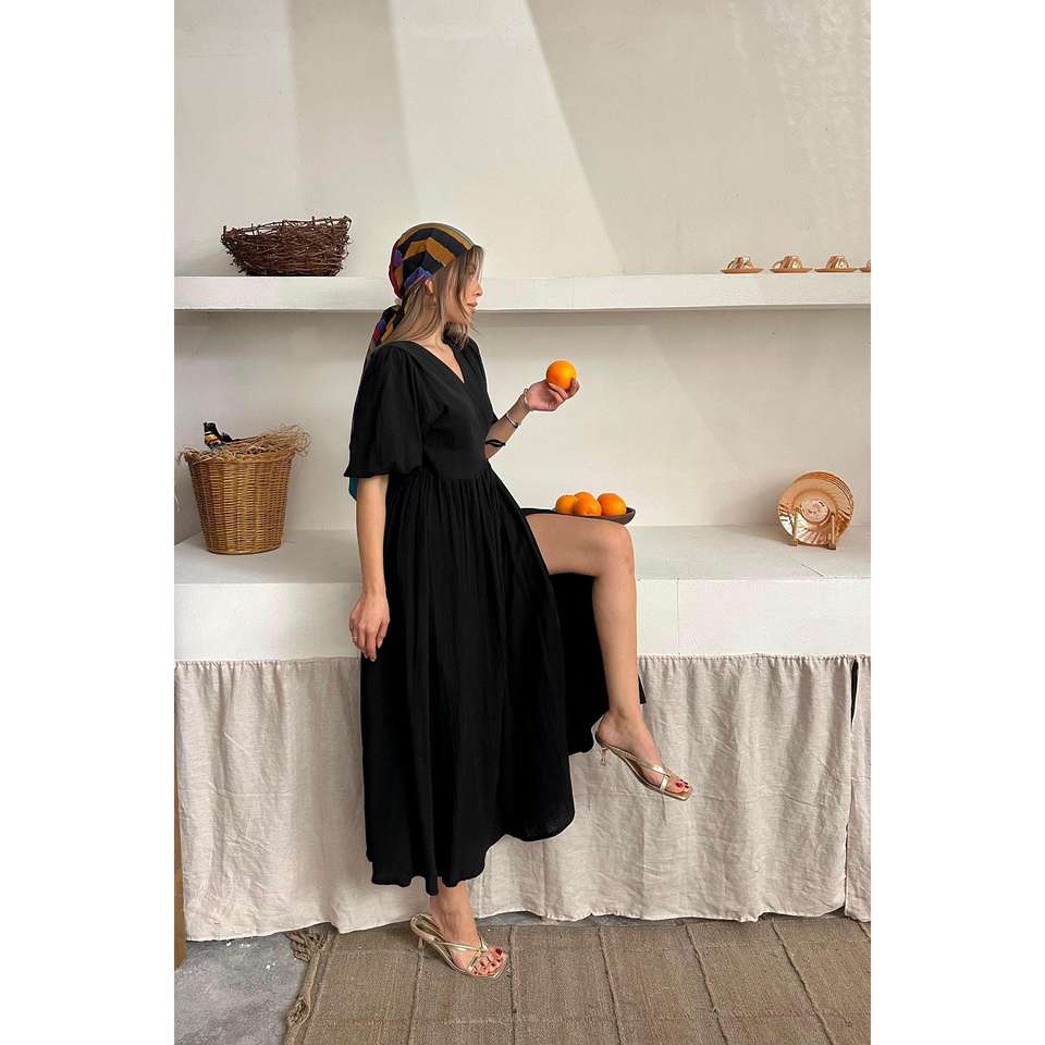 เดรสผ้าทอทรงเอไลน์คอวีสีดำ เอวธรรมชาติ ระบายอากาศได้ดี สวมใส่สบายๆ ทุกวัน