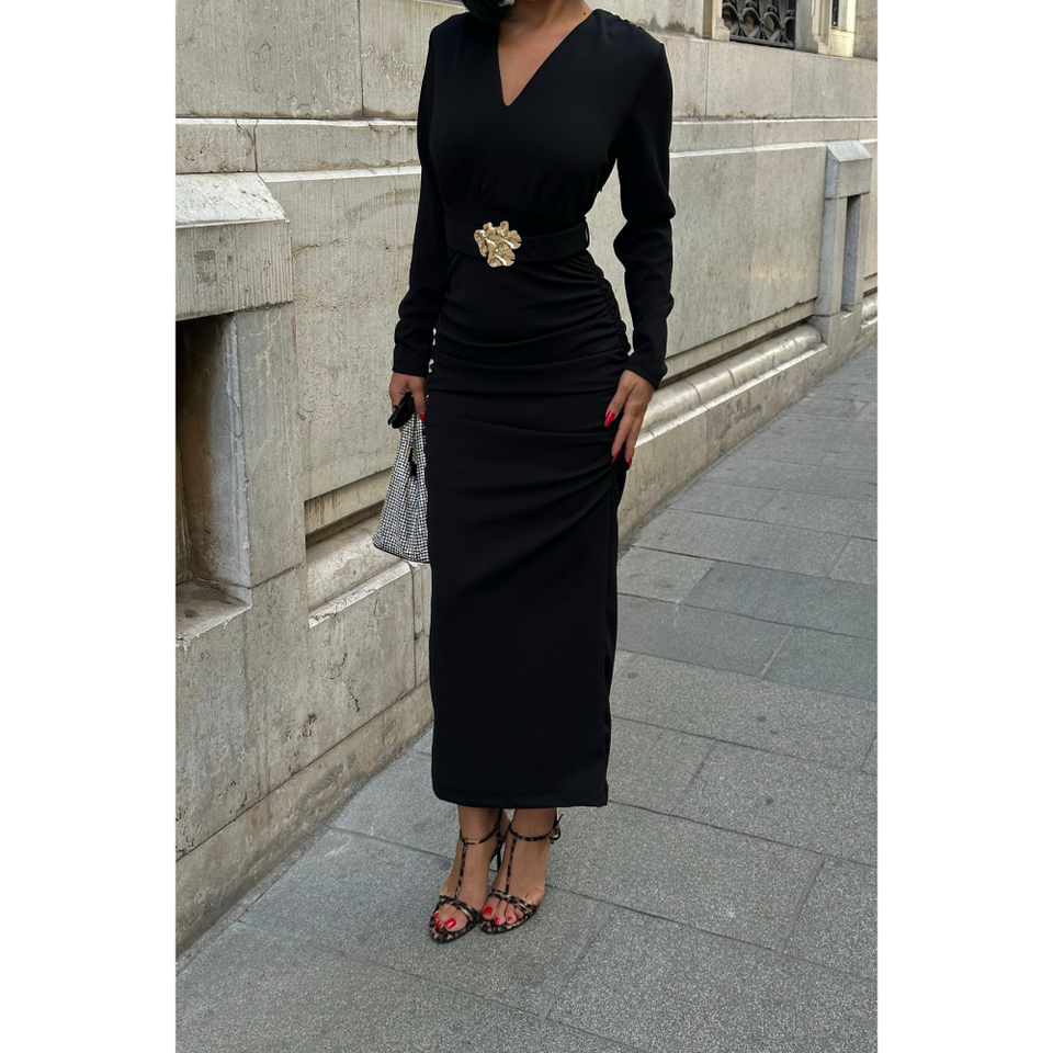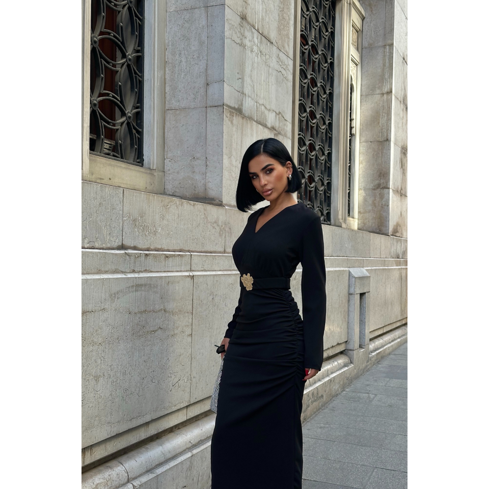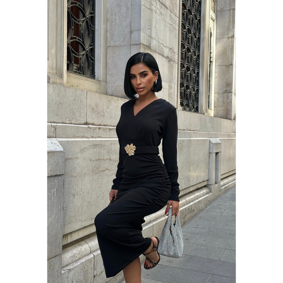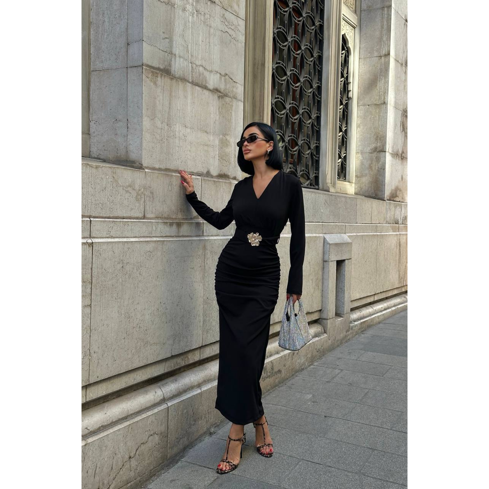เดรสทำงานทรงวีคอสีดำ แขนยาว ผ้าจับเดรป พร้อมดีเทลประดับที่เอว