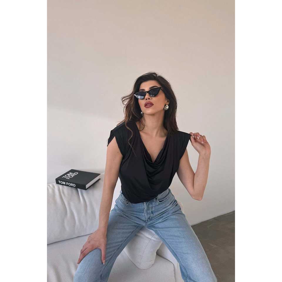 เสื้อกล้ามถักคอวีสีดำ เสื้อแขนกุดเสริมฟองน้ำสำหรับผู้หญิง