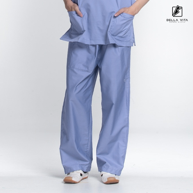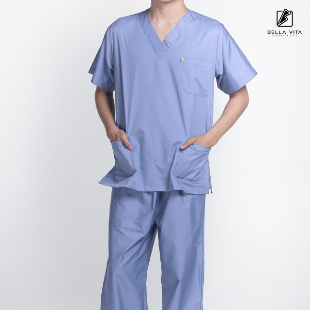 เสื้อสครับคอวีสีดำ แขนสั้น มีกระเป๋าใช้งานได้จริง 3 ช่อง สำหรับบุรุษ/สตรี ใช้ในโรงพยาบาล/ห้องปฏิบัติการ/คลินิก BELLA VITA ผ้า Air Flexcotton 65% โพลีเอสเตอร์
