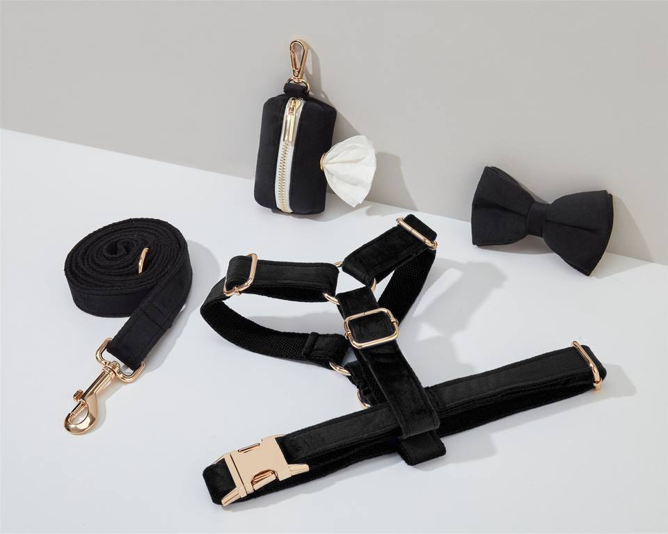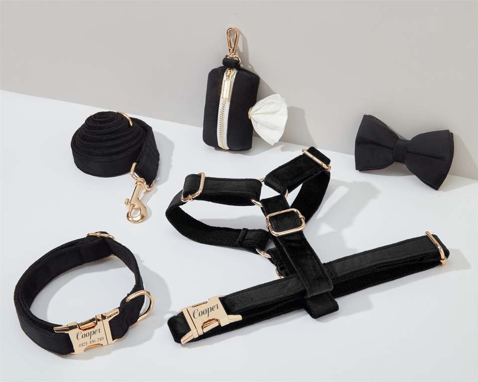 Black Veet Dog And Leash Set, Personalize Step In Puppy Harness+Collar+Bowtie+Poo Bag Holder, No Pull Wedding Harness Bundle
