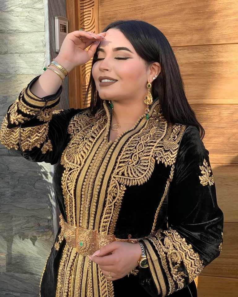 Takchita Kaftan กำมะหยี่สีดำเสื้อผ้ามุสลิมแบบดั้งเดิมงานปักสีทองระบายอากาศได้สไตล์ลำลอง XS สำหรับผู้หญิง