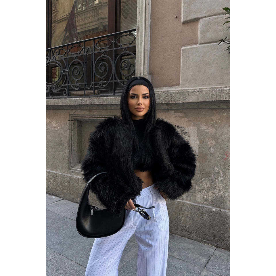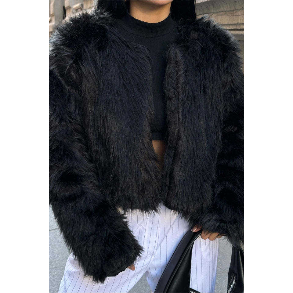 เสื้อโค้ทขนสั้นพิมพ์ลายวินเทจสีดำ ทรงยาวเข้ารูป บุด้วยขนคาเมล ติดกระดุมแถวเดียว ทำจากวัสดุผ้าไหมผสมขนสัตว์