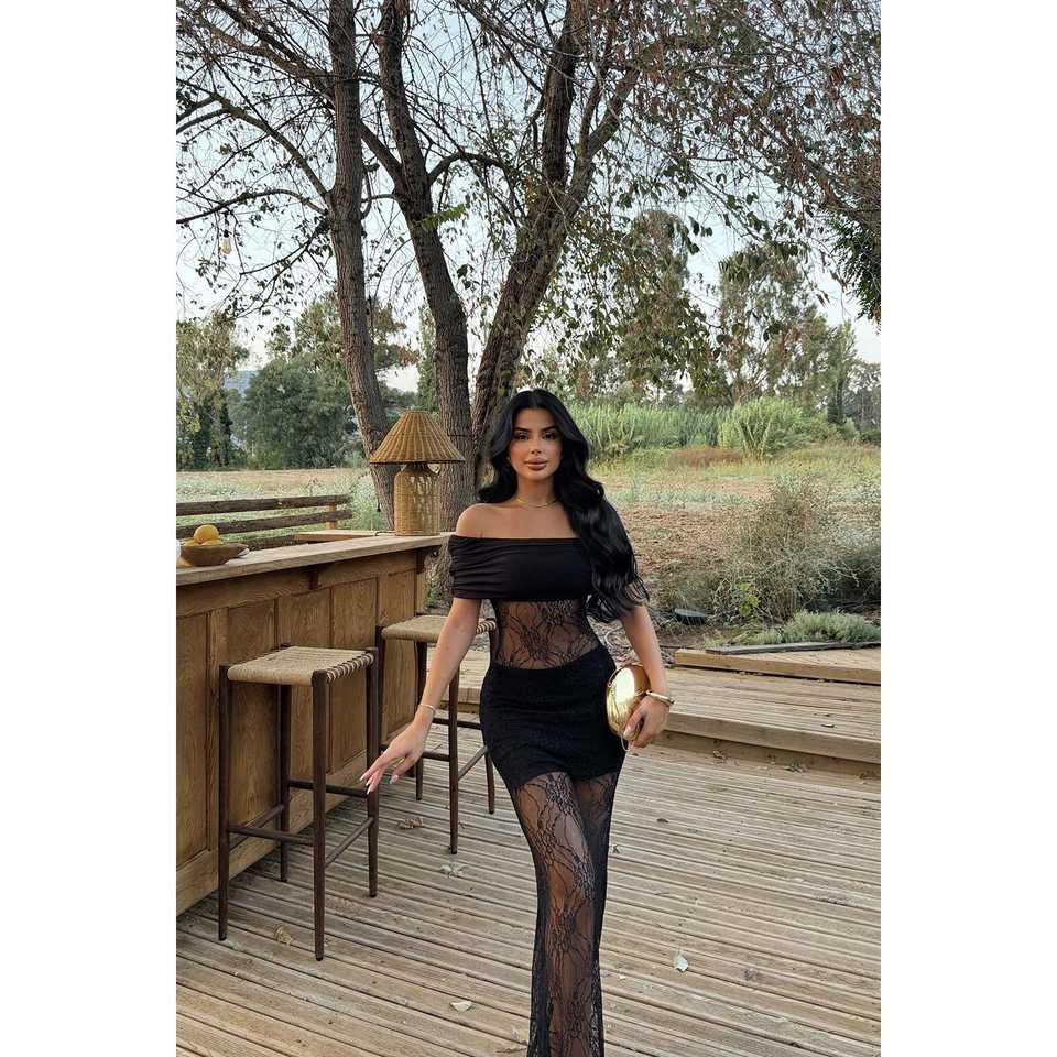 เดรสยาวสไตล์วินเทจสีดำ แต่งลูกไม้ปักเลื่อม ผ้าโพลีเอสเตอร์ถักโครเชต์ ทรงเอไลน์ เอวสูง ไซส์ XL สำหรับงานทางการ
