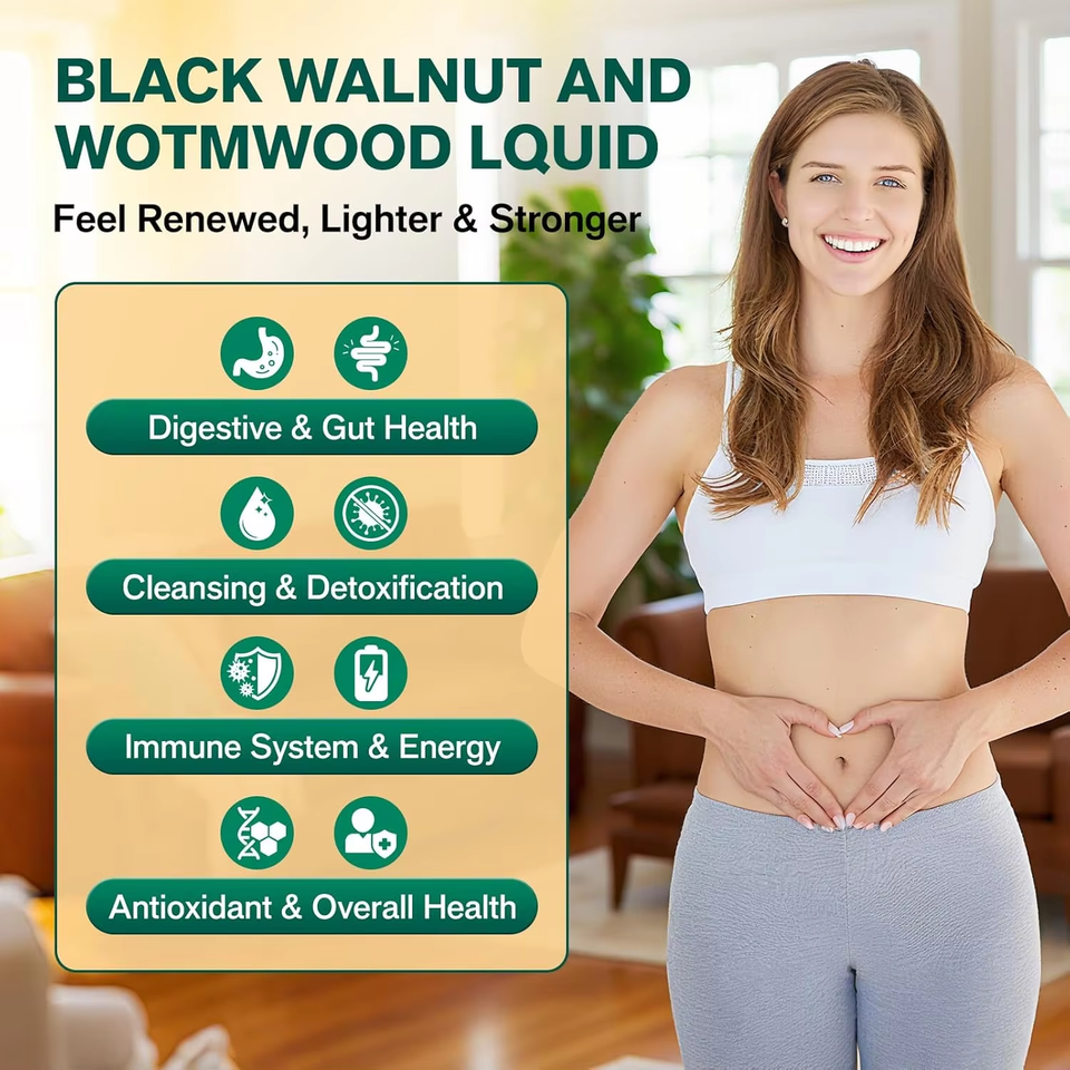 ยาสกัดน้ำแบล็ควอลนัทและวอร์มวูด ผสมกานพลู ฟักทอง โอเรกานอ ขมิ้น มะขามป้อม เบอร์เบอรีน บำรุงสุขภาพลำไส้