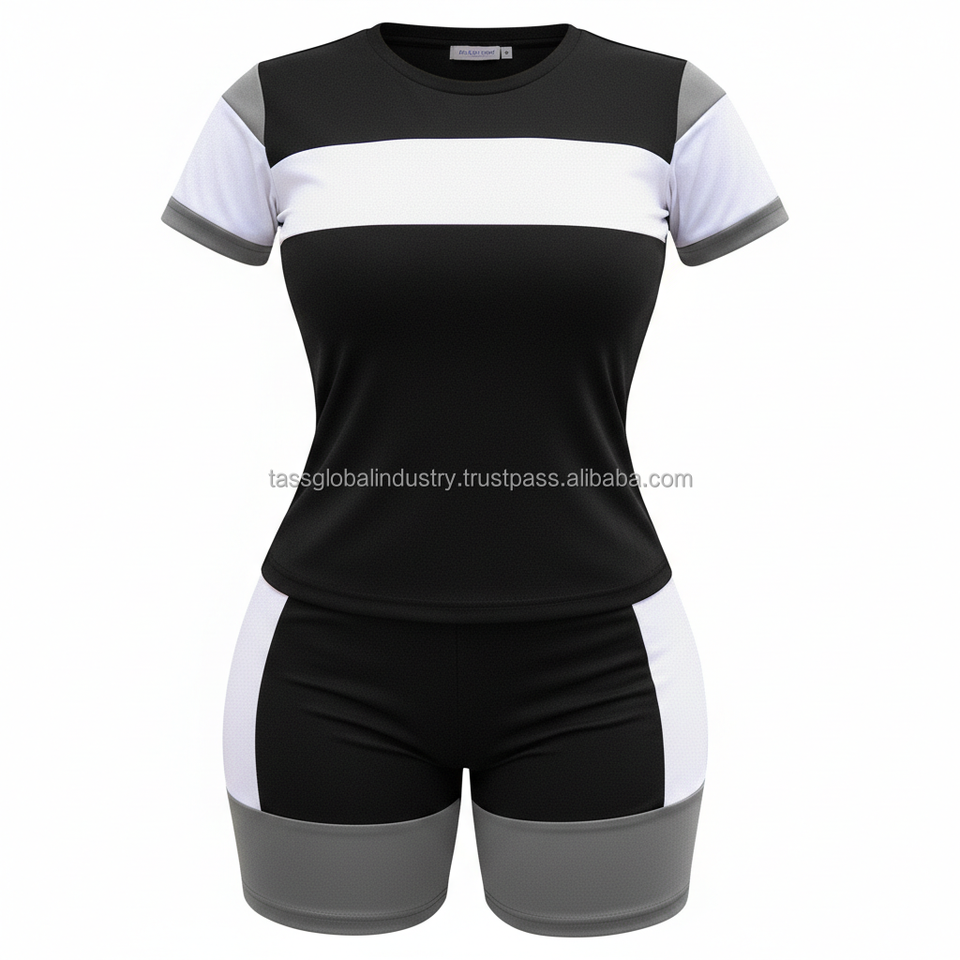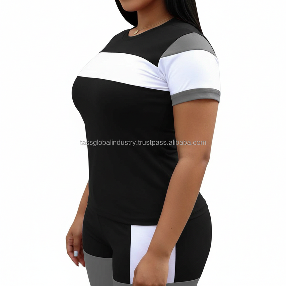 ชุดเซ็ตเสื้อยืดแขนสั้นสีดำขาวแบบบล็อกสี และกางเกงขาสั้นเอวสูงทรงสกินนี่สำหรับออกกำลังกายสำหรับผู้หญิง รับผลิตตามแบบ OEM