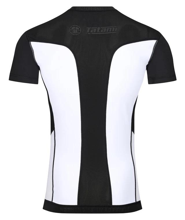 เสื้อแรชการ์ดแขนสั้นสีดำ-ขาว ระบายอากาศได้ดี พร้อมโลโก้ตัดสีและลายพิมพ์แบบรีดร้อน
