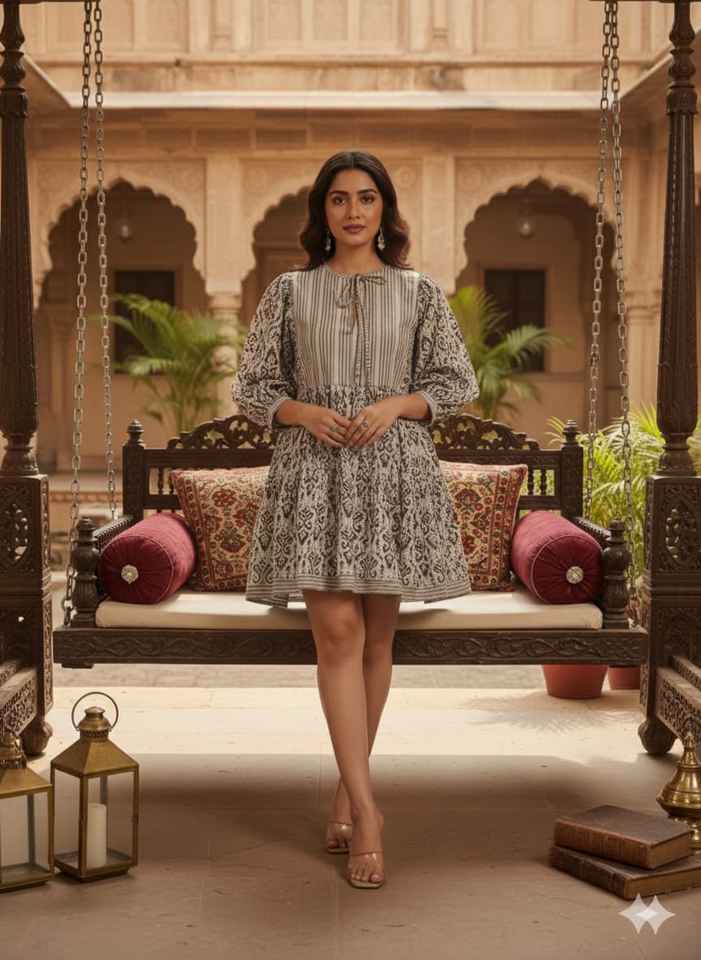 ชุดเดรสสั้นผ้าฝ้ายพิมพ์ลายดิจิตอลสีขาวดำ สไตล์โบฮีเมียนสำหรับผู้หญิง งานฝีมืออินเดีย เหมาะสำหรับงานเทศกาล เอวเข้ารูป