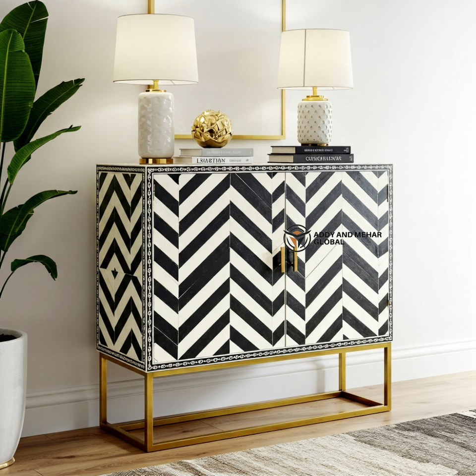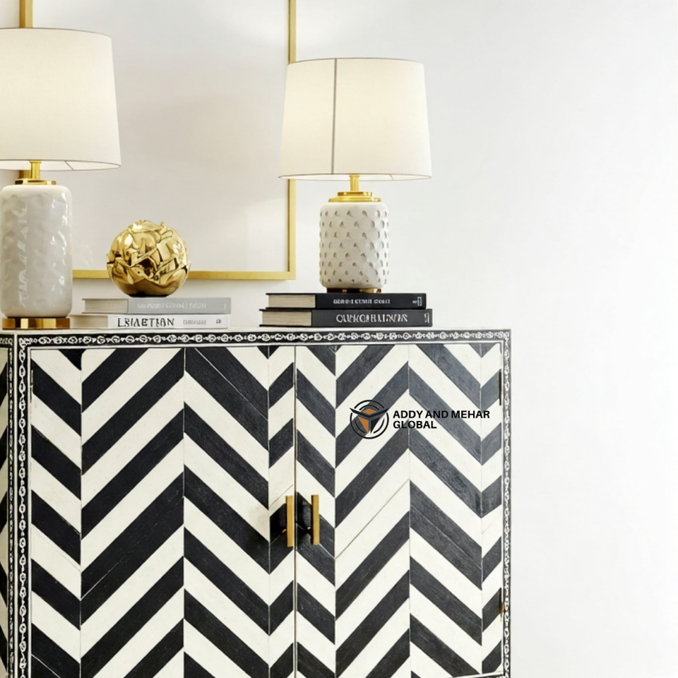 ตู้บุฟเฟต์ไม้เนื้อแข็งลายเรขาคณิตสีดำขาว ตกแต่งด้วยงานฝังกระดูก สไตล์ฟาร์มเฮาส์ ตู้โชว์ดีไซน์เนอร์ ความจุขนาดใหญ่ เหมาะสำหรับห้องนั่งเล่น บาร์ในบ้าน