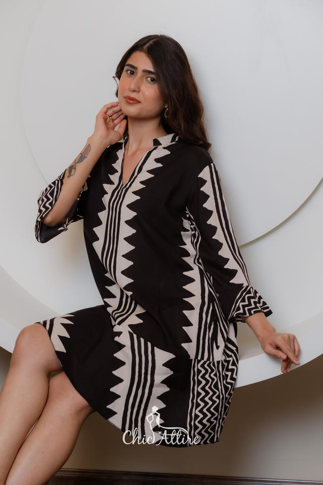 เดรสยาวถึงเข่าขนาดเล็กทรงหลวมสีดำและสีขาวพิมพ์ลายเรขาคณิตสั้นทรงโบฮีเมียนทรงหลวมฤดูร้อนสำหรับผู้หญิง