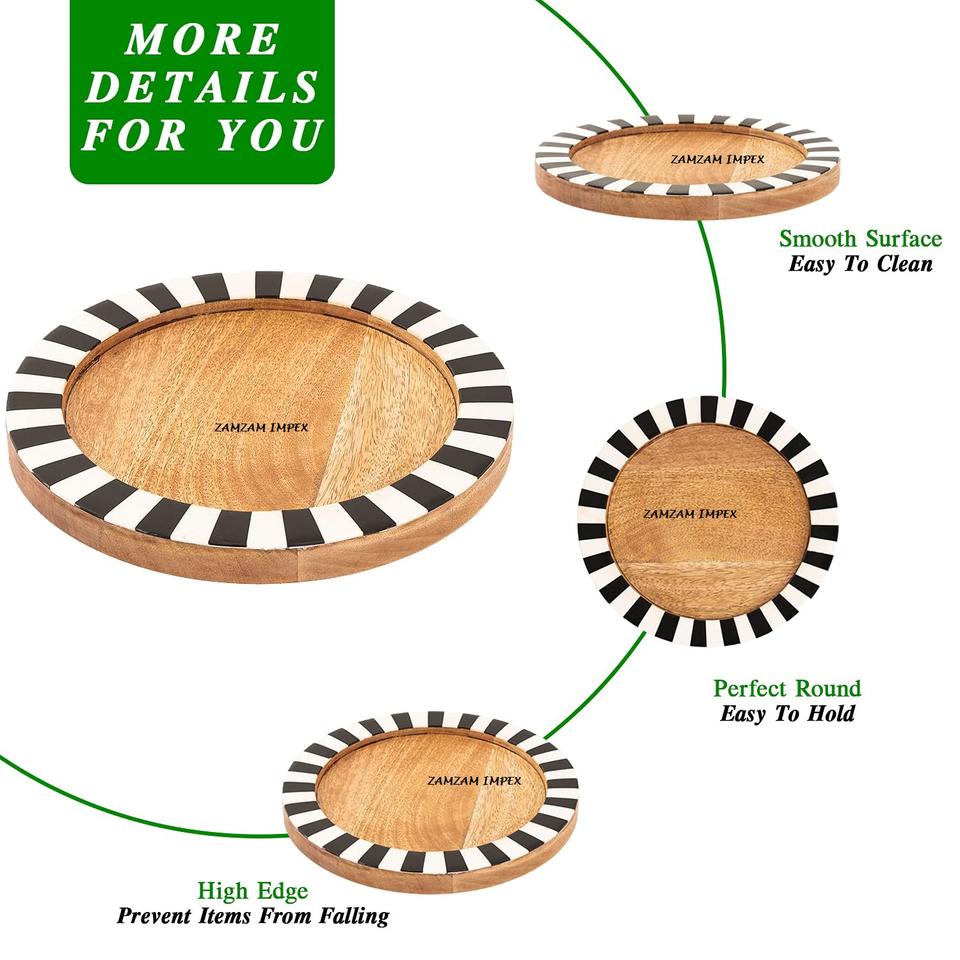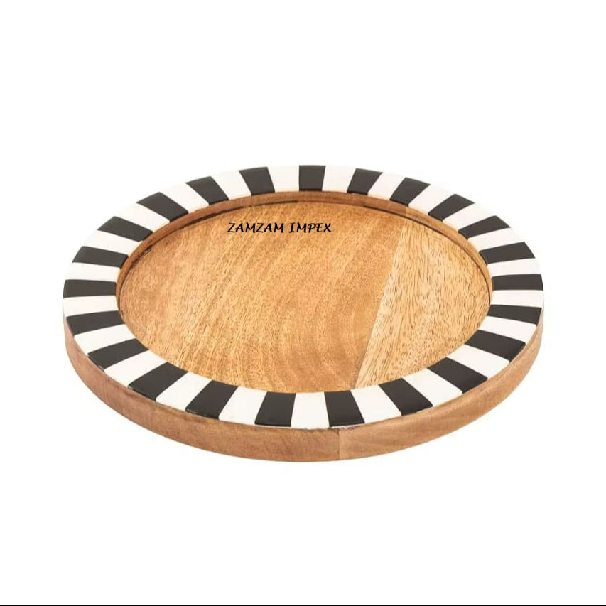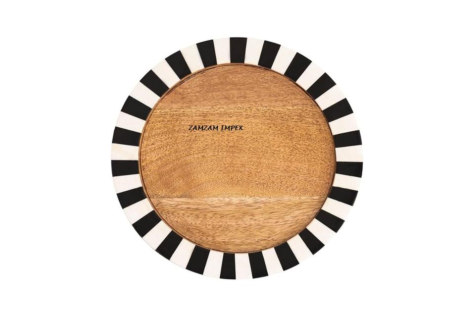 ถาดเสิร์ฟพร้อมที่วางเค้กทำด้วยมือทำจากเรซินไม้ทรงกลมลายเรขาคณิตแนวนอนสีขาวสีดำ
