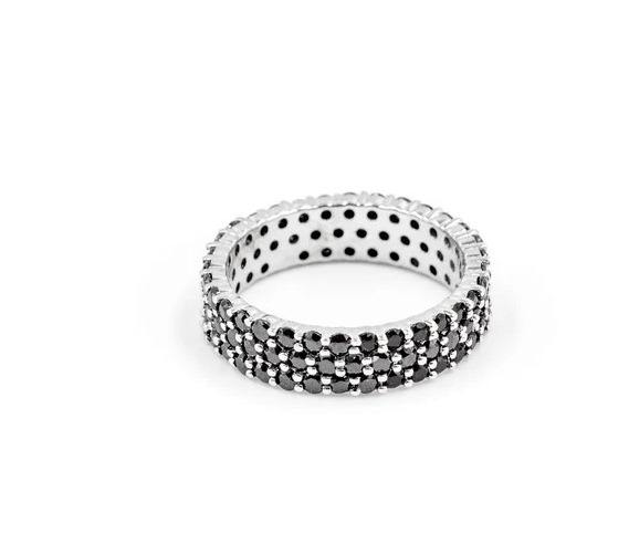 แหวนเพชรมออิสซาไนต์ทรงกลมสีดำและสีขาวแหวนเพชรโมอิสซาไนท์สีเงินสเตอร์ลิงและเครื่องประดับอื่นๆ