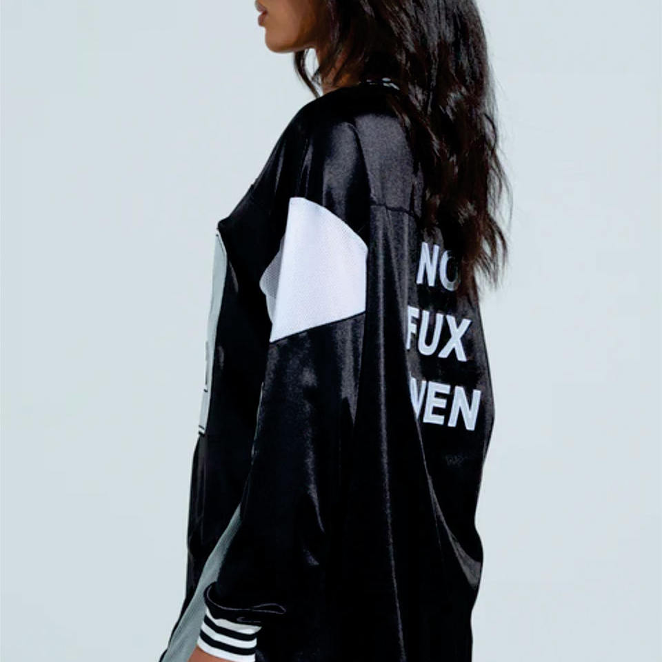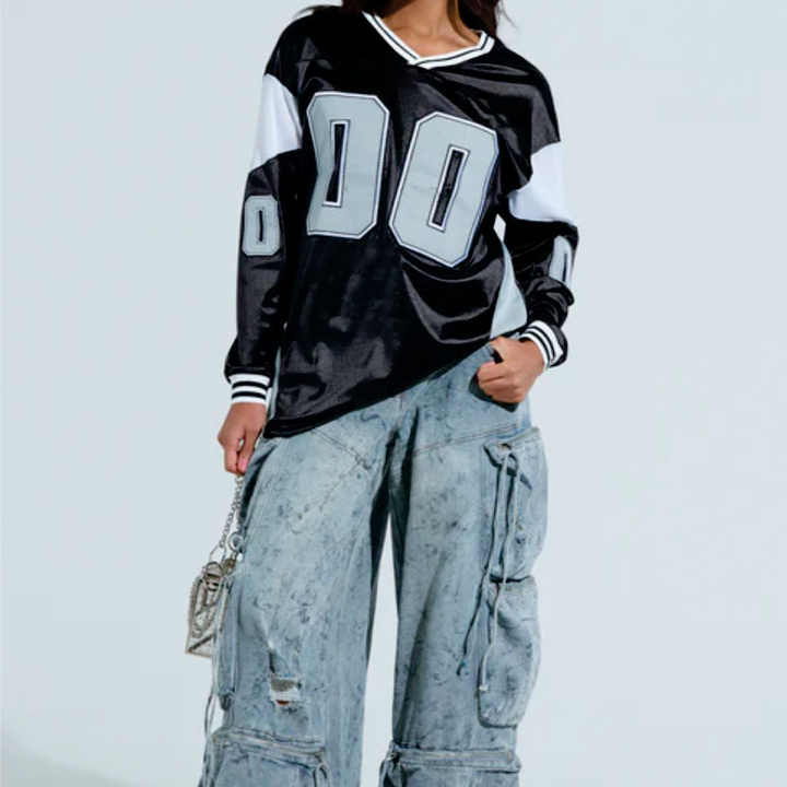 เสื้อเจอร์ซีย์อเมริกันฟุตบอลสีดำแบบขายส่ง ทรงโอเวอร์ไซส์ แขนยาว คอวี สตรีทแวร์ ปักลายหมายเลขตามสั่ง
