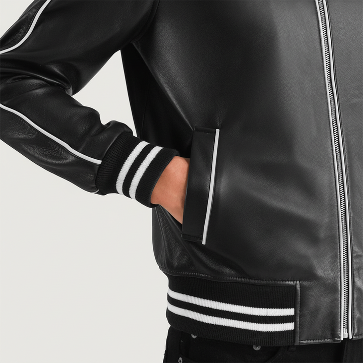 แจ็คเก็ตหนังผู้ชายสีดำสำหรับฤดูหนาว กันน้ำ ปรับแต่งได้เต็มที่ หนังแกะแท้ 100% ซิปด้านหน้า สไตล์สตรีทแวร์