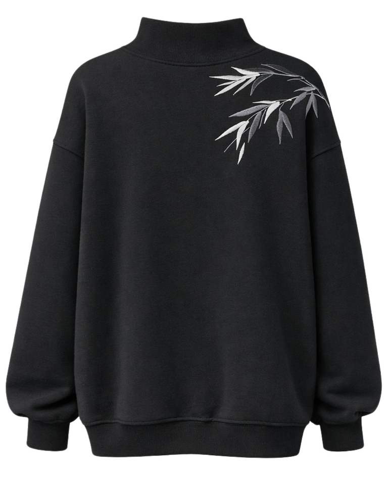 เสื้อสเวตเชิ้ตผู้หญิงสีดำ ทรงโอเวอร์ไซส์ ผ้าฟลีซ คอสูง ปักลายไม้ไผ่ สวมใส่สบาย อุ่นในฤดูหนาว ผ้าฝ้ายผสมโพลีเอสเตอร์ ทรงหลวม