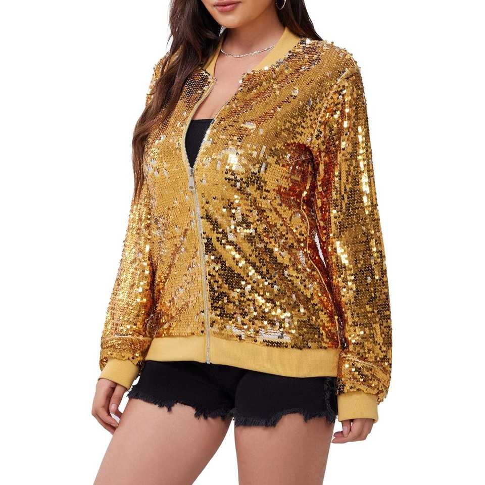 เสื้อแจ็คเก็ตปักเลื่อมสำหรับผู้หญิงสุดหรู สีทอง เหมาะสำหรับงานปาร์ตี้ ดีไซน์เปิดด้านหน้า สวมใส่สบาย ผลิตจากเลื่อมแท้