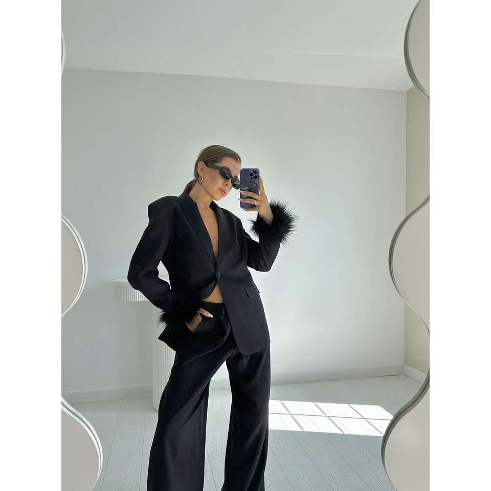 ชุดสูทผู้หญิงสีดำ กางเกงแจ็คเก็ตผ้าซาตินพร้อมข้อมือขนสัตว์ ชุดทางการ