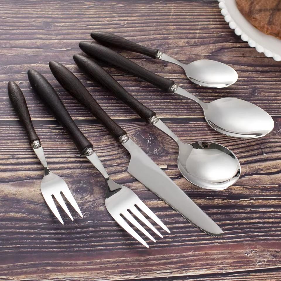 ชุดช้อนส้อมด้ามไม้สีดำ หัวสแตนเลสสีเงิน เหมาะสำหรับมื้ออาหารที่บ้าน การสังสรรค์ครอบครัว งานอีเว้นท์ และงานจัดเลี้ยง