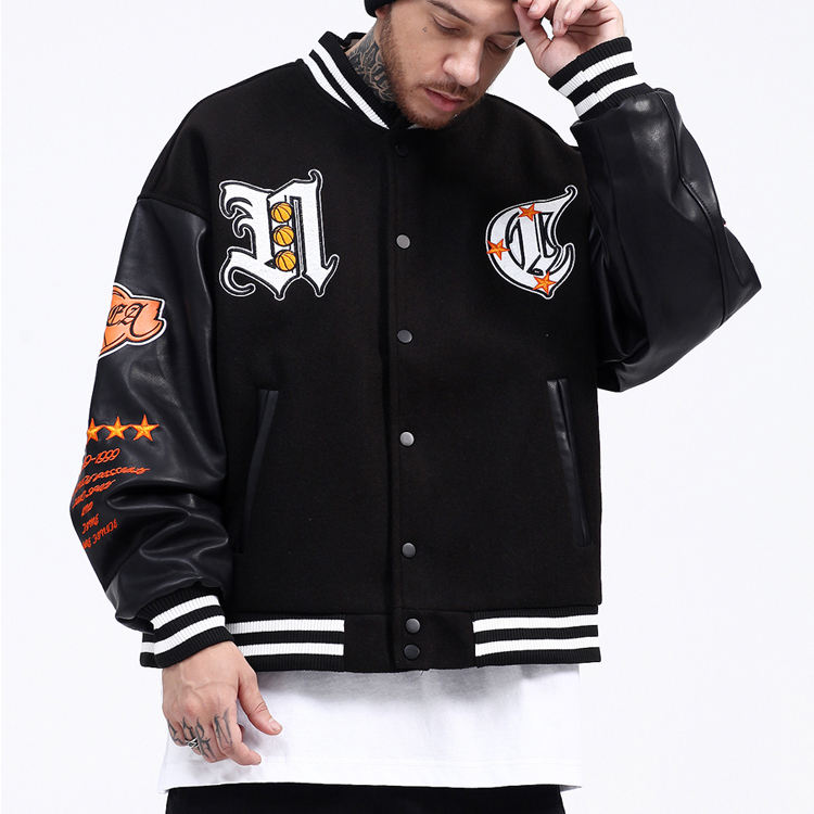 เสื้อแจ็คเก็ตวาร์ซิตี้แบบกำหนดเอง สีดำทำจากผ้าขนสัตว์และโพลีเอสเตอร์/คอตตอนสีส้ม กันน้ำ ระบายอากาศได้ดี เหมาะสำหรับฤดูหนาว พร้อมตกแต่งด้วยการปัก