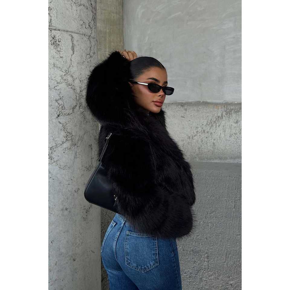 เสื้อโค้ทเทรนช์ผ้าขนสัตว์สีดำและผ้าไหม พร้อมฮู้ดลายขนสัตว์ ปิดกระดุมแถวเดียว เสื้อคลุมกันหนาวเคลือบผิว