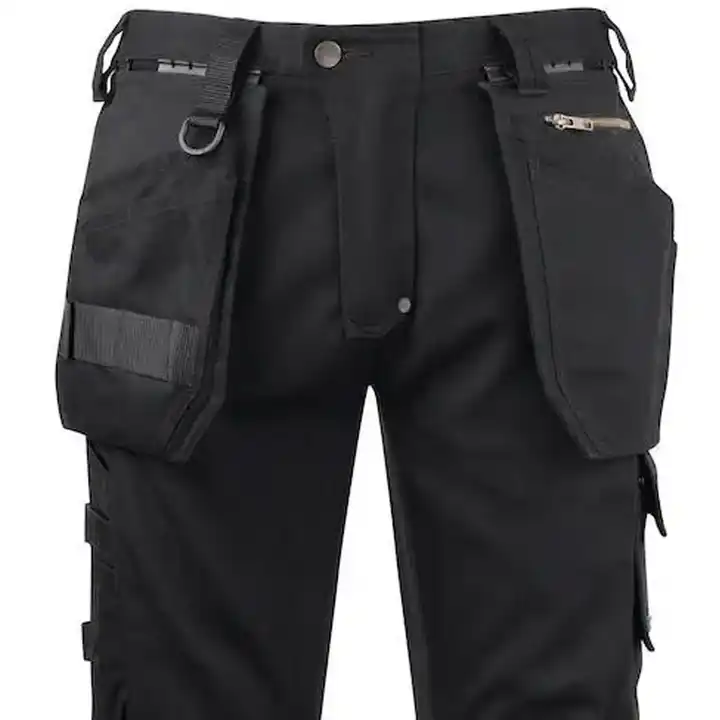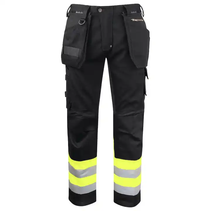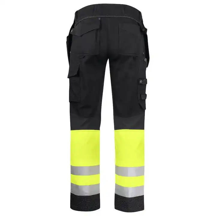 กางเกงทำงานคาร์โก้โพลีเอสเตอร์อุตสาหกรรมกางเกงเซฟตี้แบบมีกระเป๋าหลายช่องสะท้อนแสงผ่านการรับรอง CE สีดำสีเหลือง
