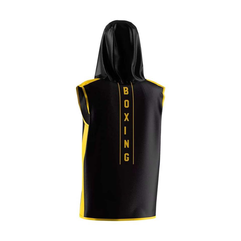 เสื้อแจ็คเก็ตสำหรับเข้าริงมวยสีดำลายแถบข้างสีเหลืองแบบมีฮู้ดไม่มีแขนเสื้อ แบบสั่งทำพิเศษด้วยเทคนิค Sublimation สำหรับนักมวย