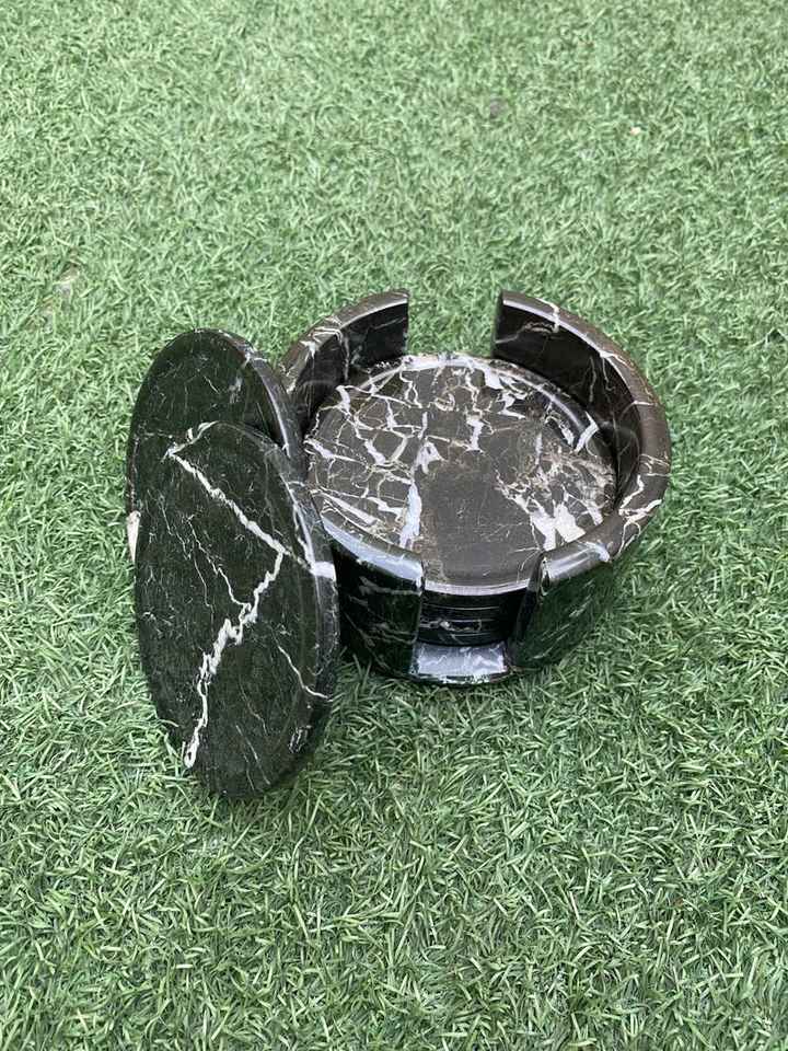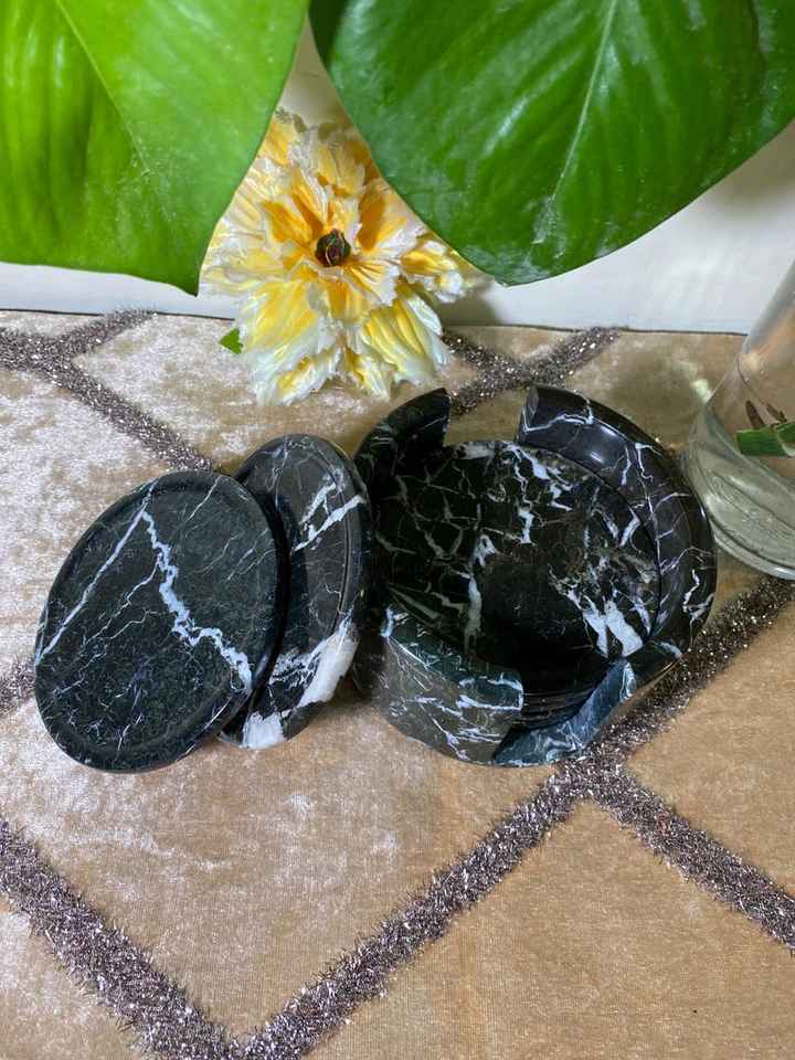 ชุดจานรองแก้วหินอ่อนลายม้าลายสีดำ 6 ชิ้น พร้อมที่วาง ทำด้วยมือ
