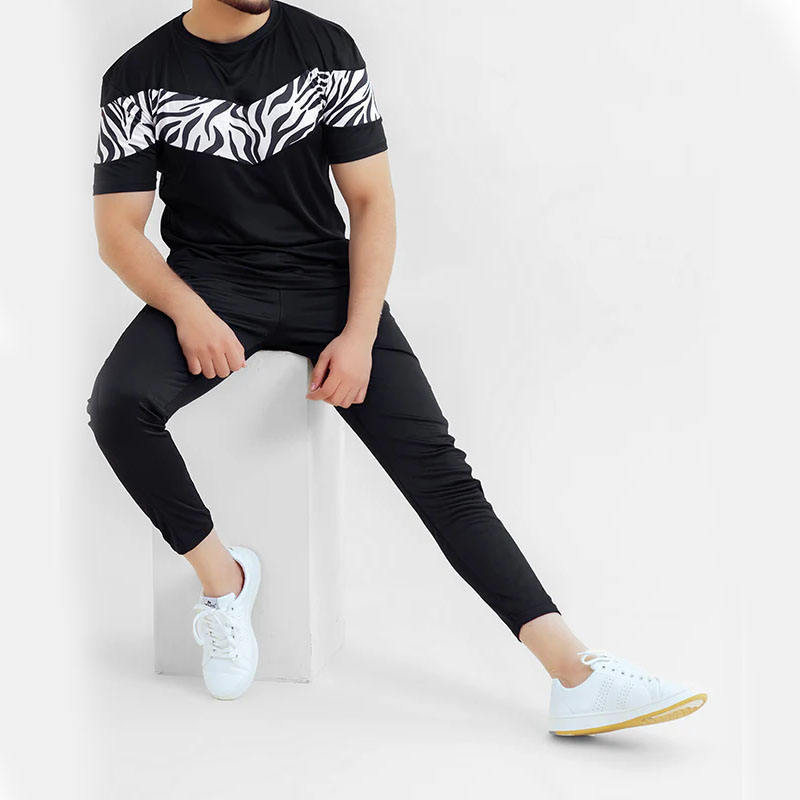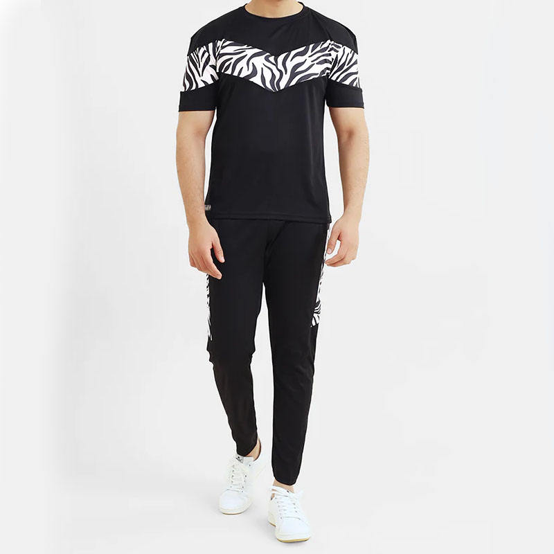 ชุด2ชิ้นเสื้อยืดและกางเกงจ็อกเกอร์สำหรับผู้ชายชุดออกกำลังกายแขนยาวพิมพ์ลายม้าลายสีดำ