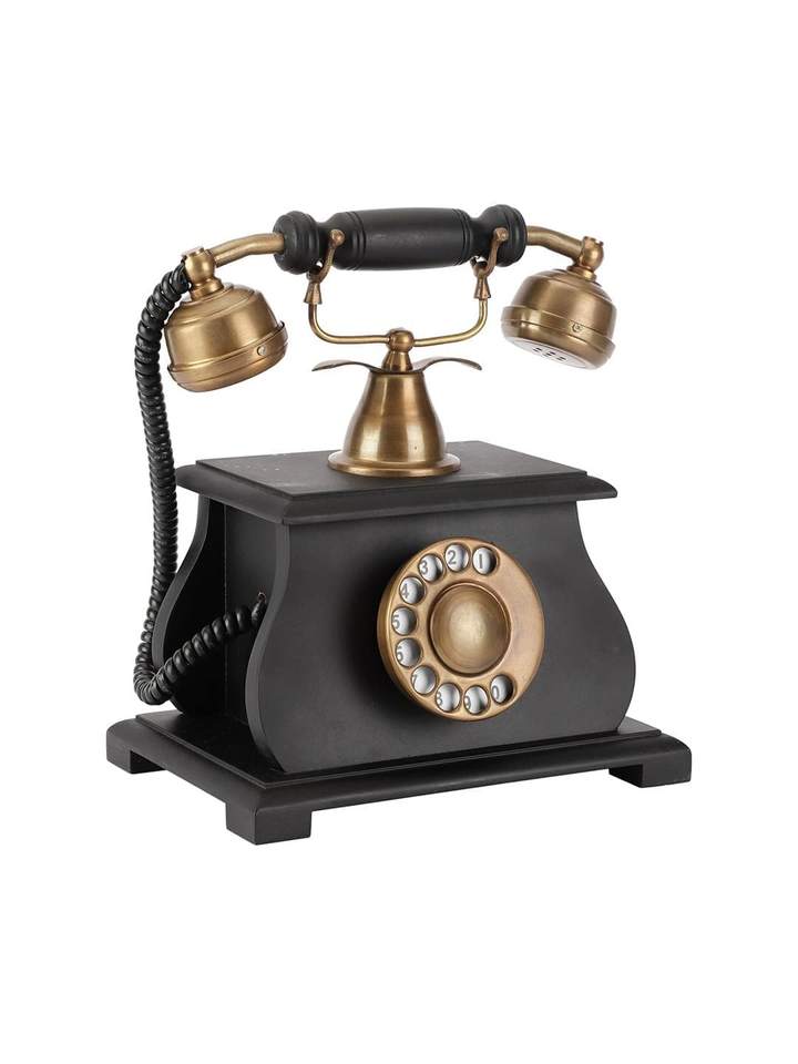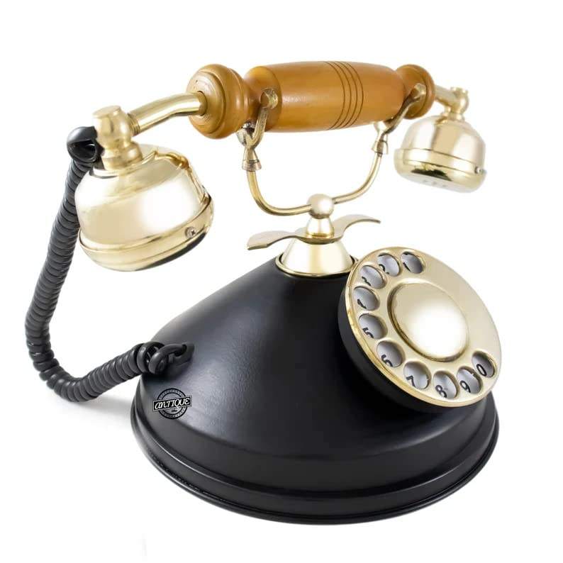 โทรศัพท์สีดำและทองเหลืองวิคตอเรียเก่าดูโทรศัพท์บ้านไม่ทำงานสำหรับการตกแต่งเท่านั้น