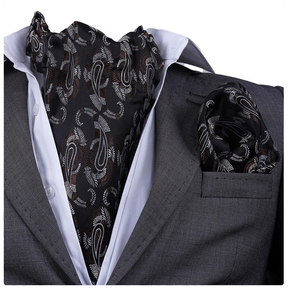 ผ้าพันคอแอสคอตสีดำและสีน้ำตาลลายเพสลีย์สุดหรู ผลิตจากผ้าแจ็คการ์ดพิมพ์ลายอย่างประณีต นำเข้าจากตุรกี ชุดผ้าพันคอสุดพิเศษ เหมาะเป็นของขวัญงานแต่งงานสุดหรู